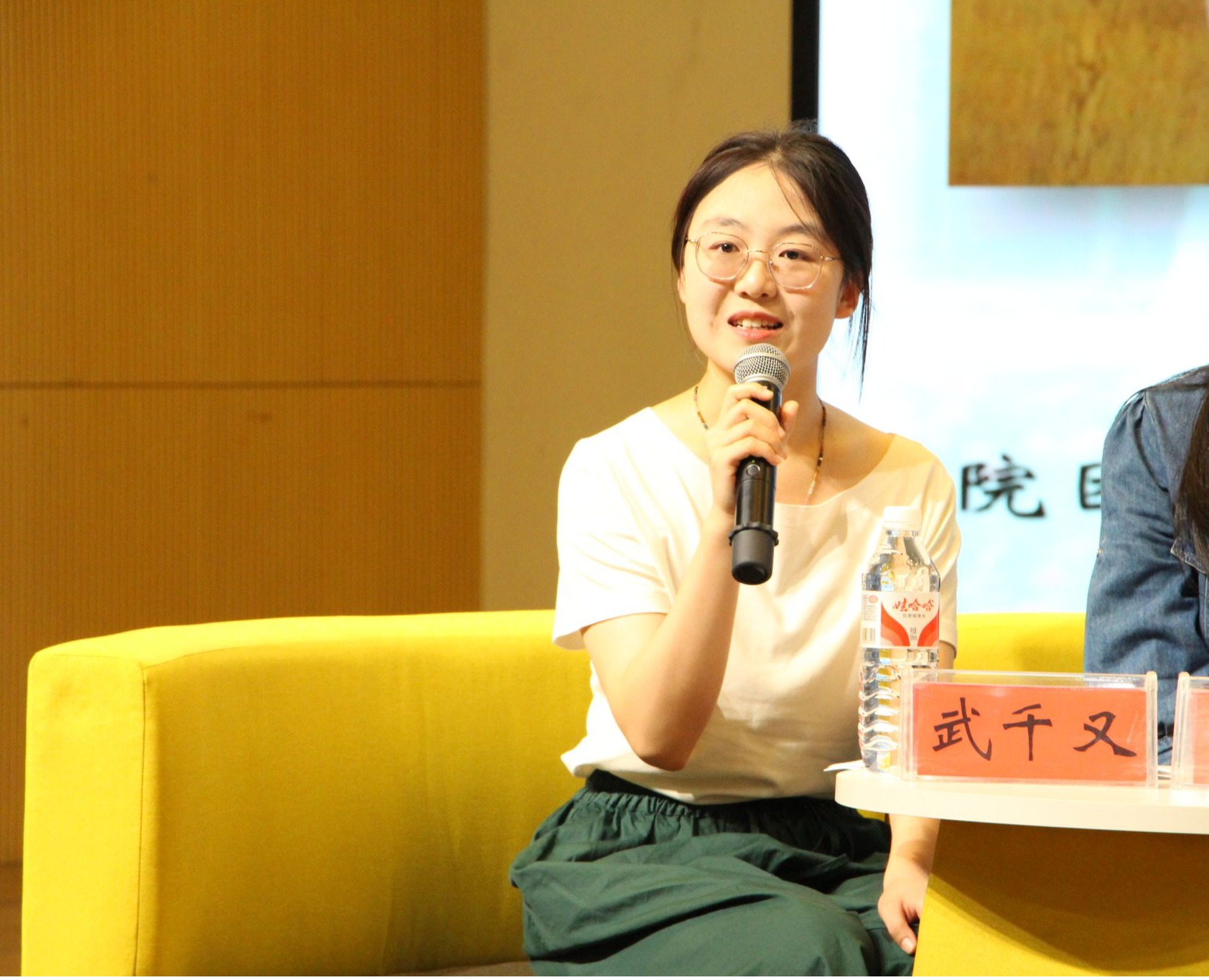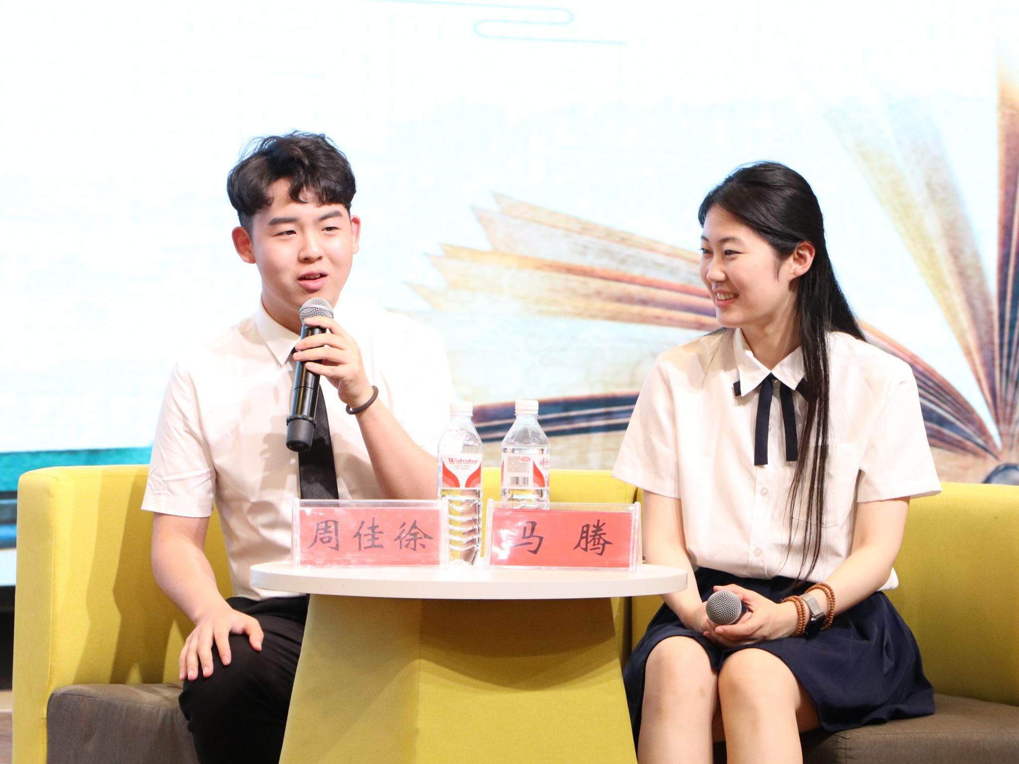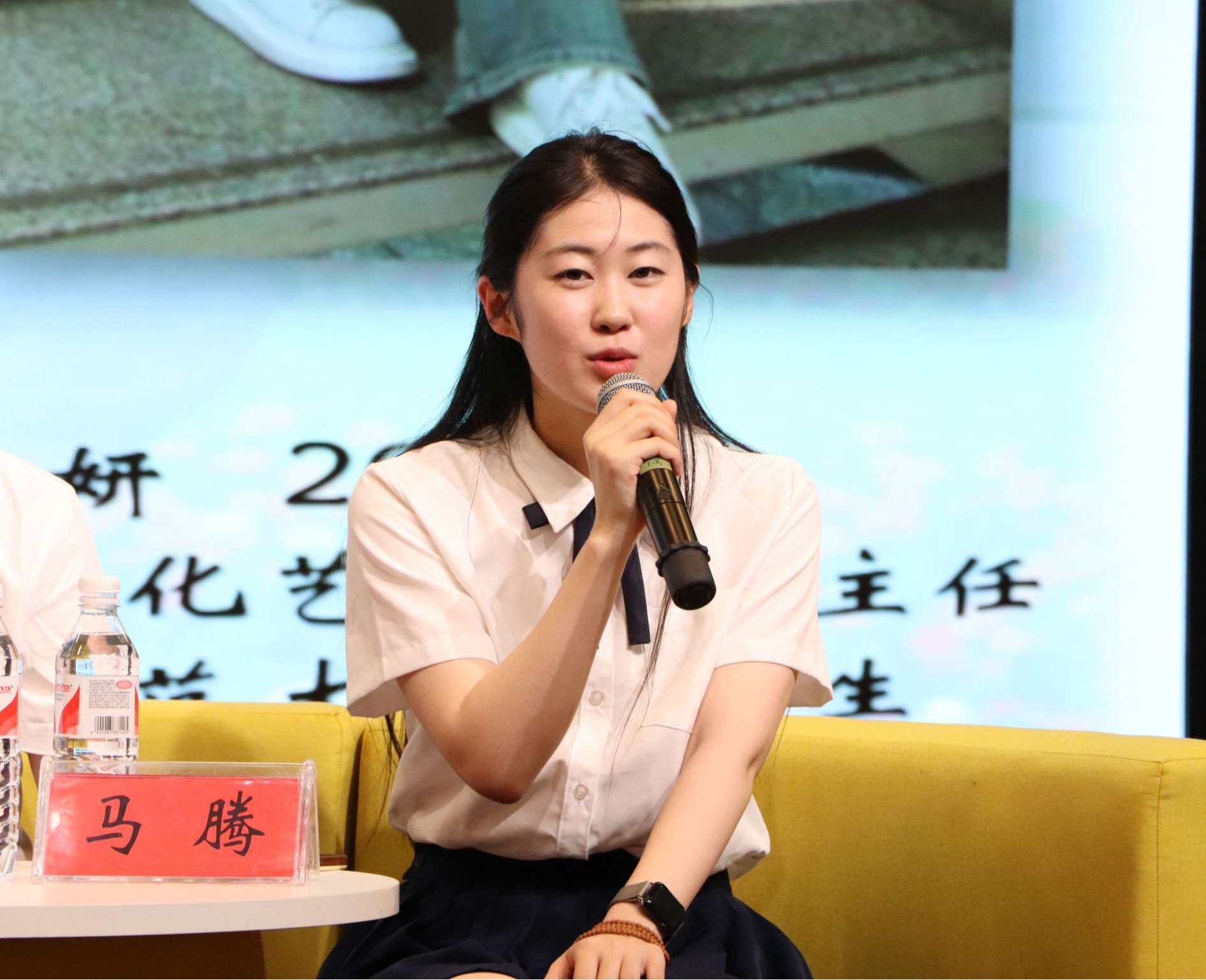 在“谈大学”板块,武千又从破题切入,将自己的老员工活总结为“小确幸”与“小骄傲”两个关键词。她认为,大学可以有许多肆意的想法,但最后都归于平静而踏实的努力学习,这样才能带来小确幸;参加征文活动、社团活动和文学创作所获得的成功与自信,可以组成生活中的小骄傲。沙妍以坚定成为一名教师的梦想为主线,讲述了大一转专业成为师范班的一员,大二留任文娱部副部长,大三抓住碎片化时间学习,大四考研考编同时进行,最后成功上岸、继续深造,一步步向着自己最想要实现的目标靠近的心路历程。周佳徐从他小学时期许愿得到“小蜜蜂扩音器”展开,将他与语文老师的缘分娓娓道来,送给同学们“挑战”“坚持”“自信”和“感恩”四个关键词,给予同学们诚挚的建议——“勇敢接受生命中的每一个挑战,并且去享受它。”马腾则回忆自荐为新生代表发言的经历,“我十分感谢大一那个有点莽撞又有点勇敢的自己。”鼓励同学们多去尝试新的挑战,多和老师们交流讨论,这些经历都会成为日后最宝贵的财富。