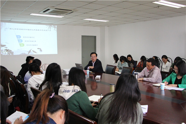 王建军教授首先以当下引起热议的《中国诗词大会》和特朗普外孙女演唱中国名曲《茉莉花》作为切入点,通过大数据统计引出了当下职工对中国诗词大会的高度关注及国外的“汉语热”,分析了对外汉语教学市场的需求现况,展示了汉语国际推广的重要性。然后,王教授从古典诗词成语的产生、传播、基本特点、古典诗词与成语的关系和生成方式等方面,通过大量生动活泼的案例,阐明了古典诗词和成语之间相依相随,相映成辉、妙不可言的历史渊源关系,让大家体味到中国古典诗词博大精深、咀嚼不尽、历久弥新的文化内涵。他指出古典诗词是成语的便捷传播载体和重要滋生地,诗词的传播历史、范围、频率都影响成语的产出,古典诗词和成语具有共同的特点,是“门当户对的绝配”。最后,王教授重点分析了古典诗词成语的对外汉语教学策略。他提出要注意成语教学难度的等级划分,并给出了诗词成语的教学实施方案,即要树立明确的教学思路,设置适当的教学重点和采取恰当的教学方法。