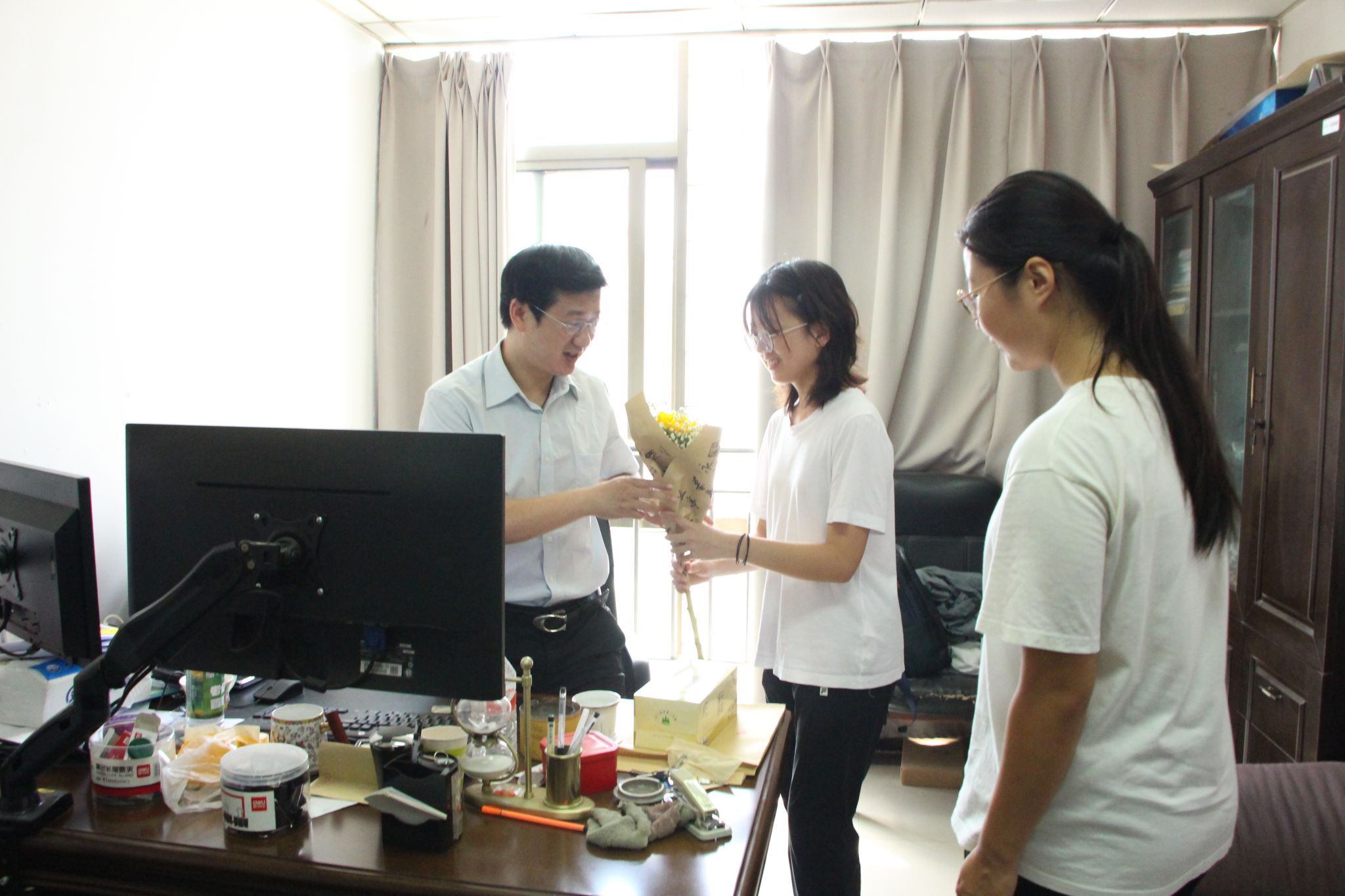 上午阳光正好,老师们有的在办公室中认真工作,有的在班级中传授知识。办公室处,员工代表朱萌萌与陈极岩手持鲜花轻轻敲门,为每一位老师送上真切的祝福。老师们手捧鲜花笑意盈盈,在相机中留下了最美的笑容。事后老师们将鲜花细致地插进花瓶中,为办公室增添了一抹明亮的色彩。