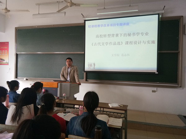 5月5日上午十点,葛志伟老师在教A3-301为必一运动文秘系1506、1506班员工作了《高校转型背景下的秘书学专业< 古代文学作品选>课程设计与实施》的专题讲座。该讲座是葛志伟老师主持的校级课程教学改革项目的重要组成部分,是吸收员工参与课程教学改革活动的重要举措。