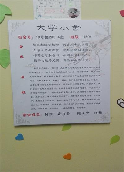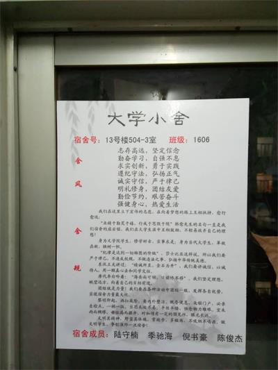正当青春年少时,常与同好争高下。经多轮评审,最终以2#224、2#227 获得“个性宿舍秀之最美宿舍”一等奖;1601徐华远、高田磊、王思莲,1604刘子婷,1606季驰海、黄湘获得“我的奇葩舍友故事会”一等奖;1501宋丹丹、张雪纯、1502苏欣佳、1603吕胜男、1606谭昕获得“晚归标语征集活动”一等奖。