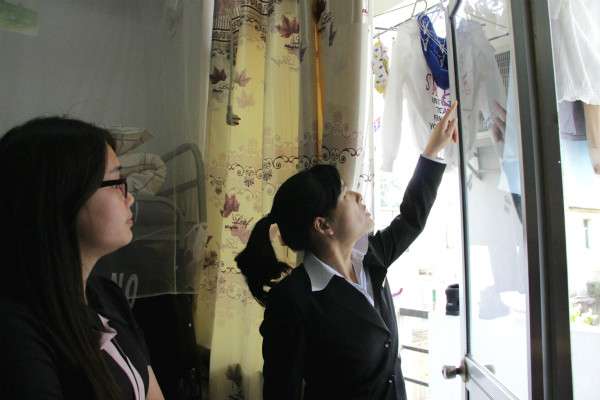 参与指导的阿姨们在自管会同学的协同下,依次进入位于一号楼、二号楼和十三号楼报名的各个宿舍,针对各宿舍存在的问题和欠妥之处提出合理有效的指导意见,并为同学们进行了耐心的现场示范。从盥洗室到阳台,从地面角落打扫到屋顶装饰,从细小的书本摆放到整体的空间布局,阿姨指导得细致而微,面面俱到,指出了内务有效管理和空间有效利用的相关注意细节,帮助同学们有针对性的进行调整。就整体而言,阿姨对宿舍的整体布置表示满意,同时也指出其中存在的一些问题,大多数集中于窗台擦拭,组合柜统一摆放,水壶安全放置等细节注意之处。