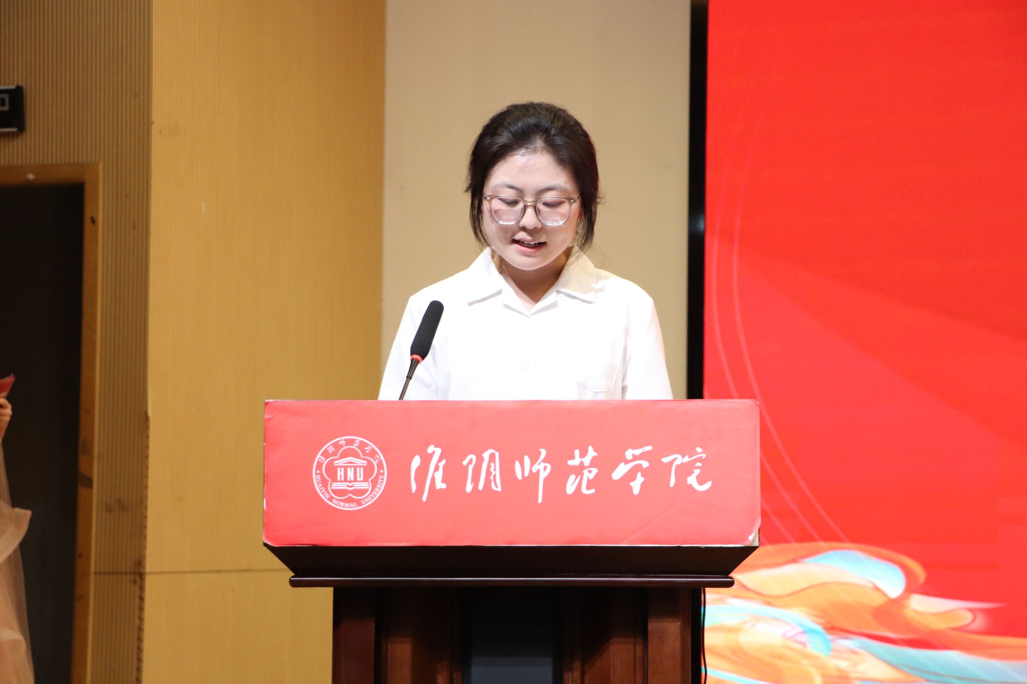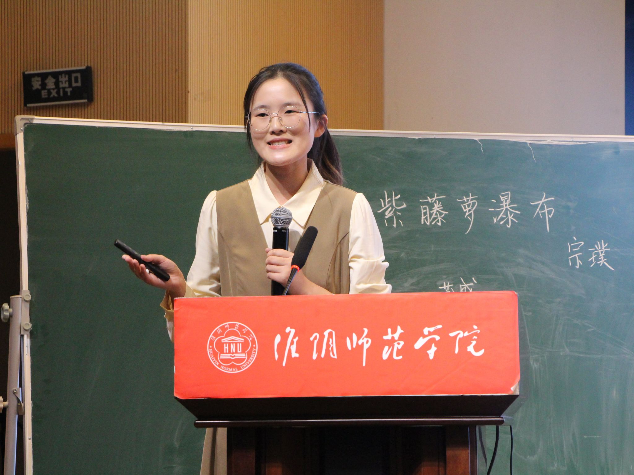 中文系主任刘飞从成长画像、实践进路和资源供给三个层面,为新生解答了“师范生将成为一个什么样的人?”“如何成为这样的人?”“公司能够提供哪些资源?”三个关键问题,消减了新生的迷茫。盛玉璇带来了《紫藤萝瀑布》的演课,她深入浅出的讲解,自然流畅的教态,展示了师范生良好的专业素养。