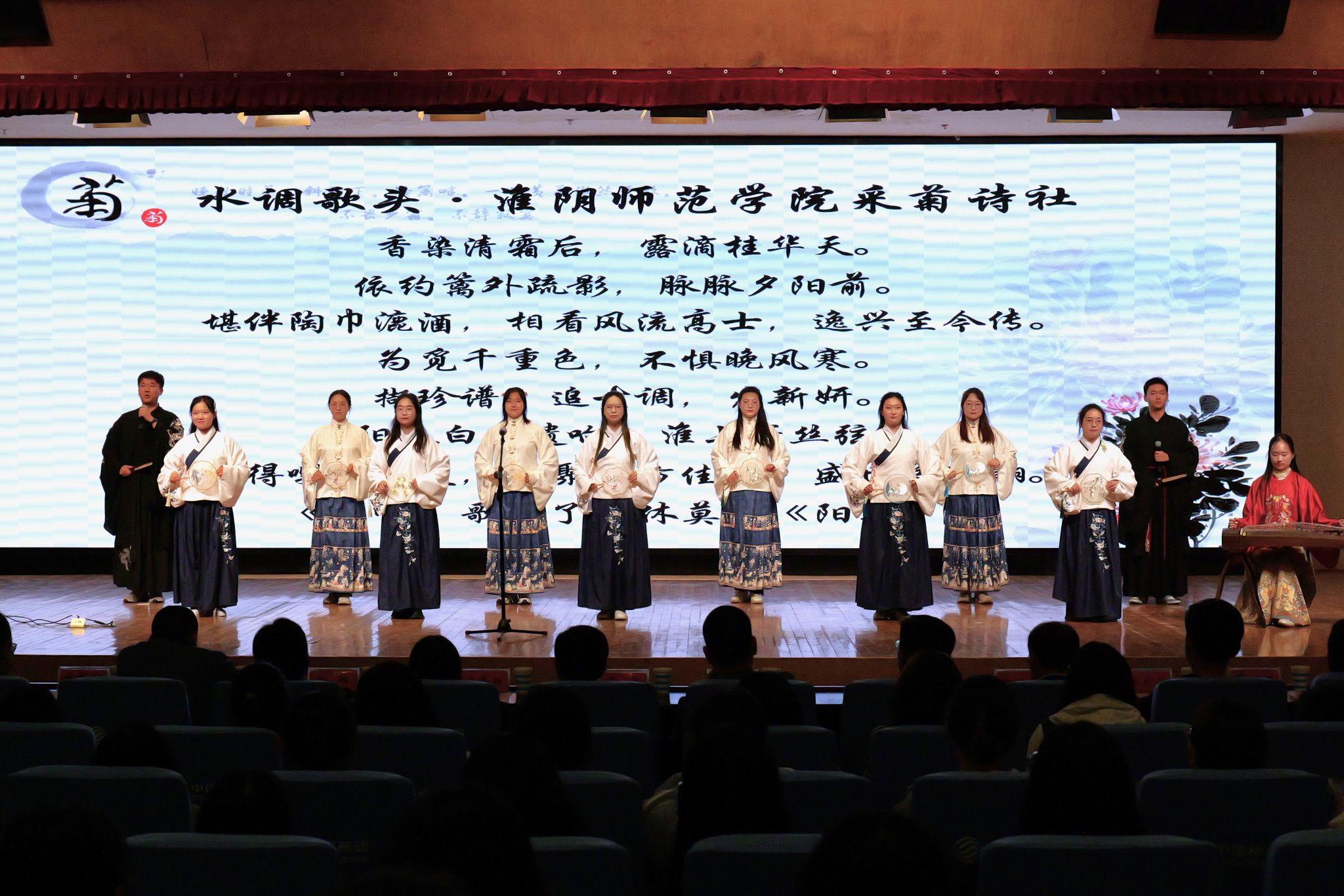 “以诗会友,雅韵流觞”。采菊诗社带来诗词吟唱《水调歌头》和《春江花月夜》,悠远绵长的歌声、古朴雅致的琴声,无不书写着独属采菊人的青春风采。必一运动新生带来朗诵《走进淮师》,“走向淮师,万里鹏程由此始;走向淮师,秋实盈枝朵朵艳”,他们的声音抑扬顿挫,鼓励大家将必一运动当作港湾,从这里扬帆起航。