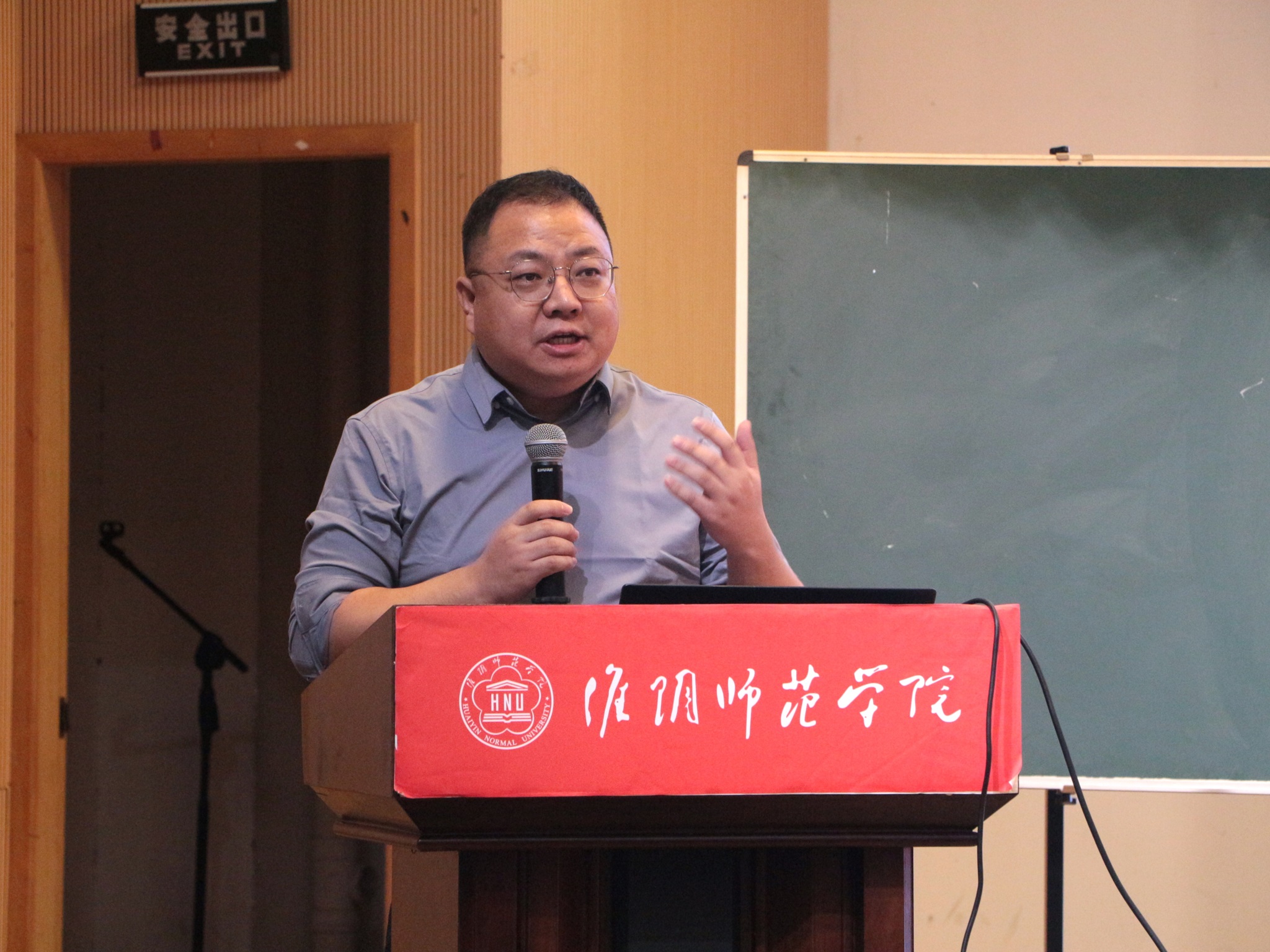 随后,中文系主任刘飞上台发言。他表示,模拟授课的展示是师范生综合素养的集中展现,希望同学们能够结合授课的具体要求及自身情况,查漏补缺,进行有针对性的训练,努力提升自己的专业素养。