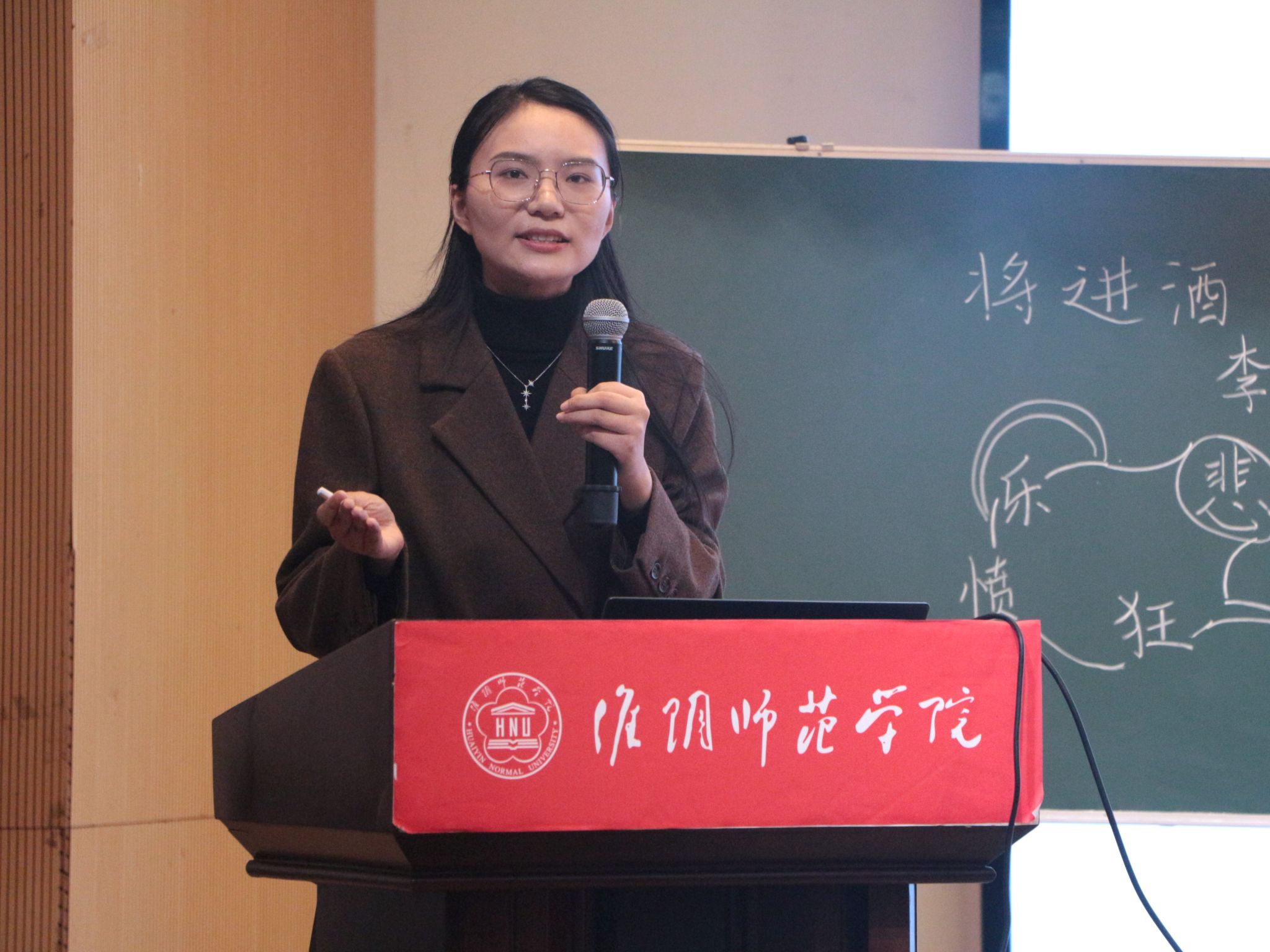23级研究生吴欣芮演课的篇目是《将进酒》,她先带领员工诵读评析《将进酒》,再将诗词与作者经历相结合,深入挖掘酒中所蕴含的复杂情感。她的教学设计严谨专业,教态舒展自然,板书设计更是别出心裁,为课堂增添了几分艺术气息。