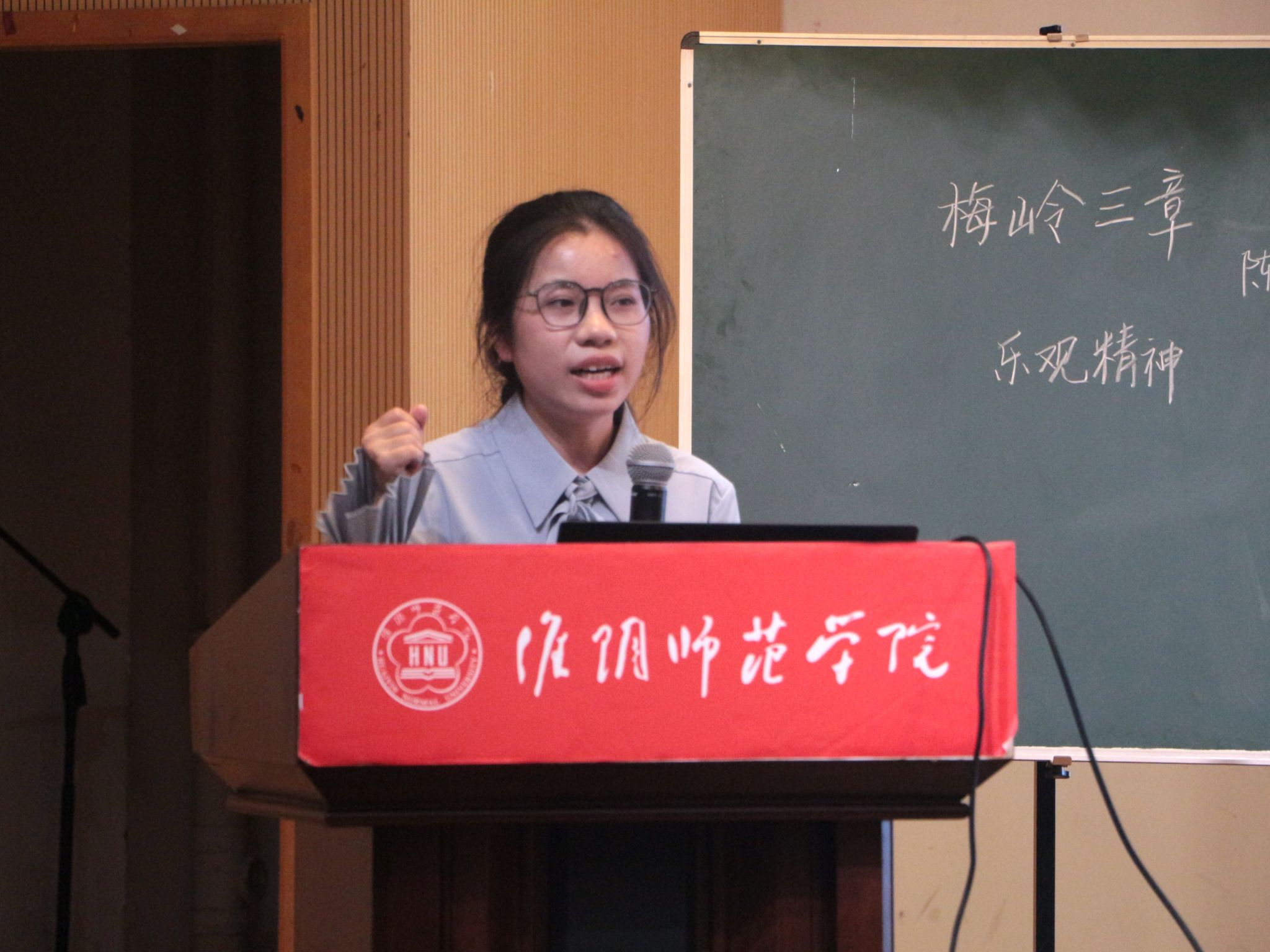 2102班的陆妍选择了《梅岭三章》作为授课篇目。她以诗词作为引子,从意象、典故和材料三个角度切入,带领员工体察诗中的情与志,授课逻辑清晰,娓娓道来。