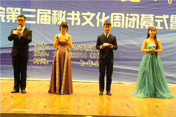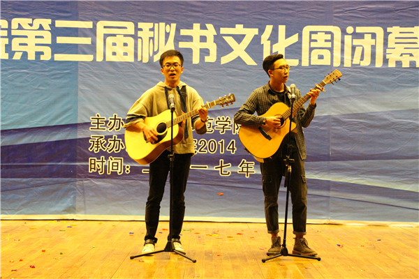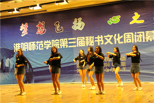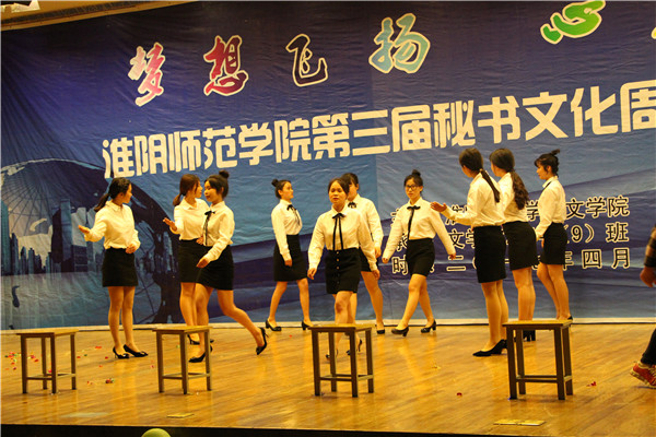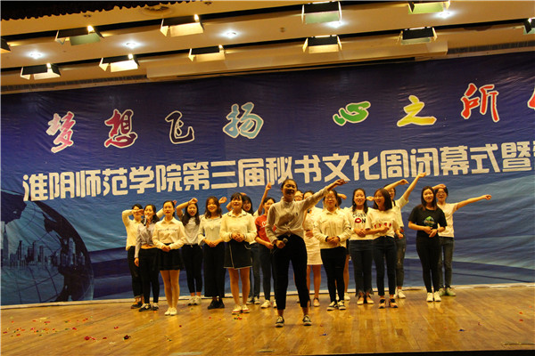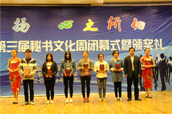 一段激情热烈的舞蹈拉开了晚会的序幕。随后,1505班的歌曲《红玫瑰》以动听的旋律唱一曲青春年少,吟一首岁月悠然。1606班的小品《总监驾到之神雕侠侣》中的幽幽情缘穿越千年,再现相思苦待亘古未变,一对眷侣在未来的时空再续前缘。传承秘书文化、弘扬秘书精神、树立秘书形象,1409班带来的《秘书礼仪舞蹈秀》以舞姿释放激情,以风采张扬青春。紧张生趣的《听歌识曲》的互动游戏环节结束后,1406班的小品《纯闺蜜》借男友对闺蜜的误会,以诙谐幽默的语言表达对了闺蜜这块生命中的拼图纯真的感情。1606班以手语操《爱》浅述世间的纷扰,以指尖的舞动传递温暖。1409班的一首《淮师版成都》婉转如初春的垂柳拂过额头,撩动着人们的心弦。表演过程中,王毅、陈华东、时名早分别为本次秘书文化周赛事中获得三等奖、二等奖、一等奖的员工颁奖。