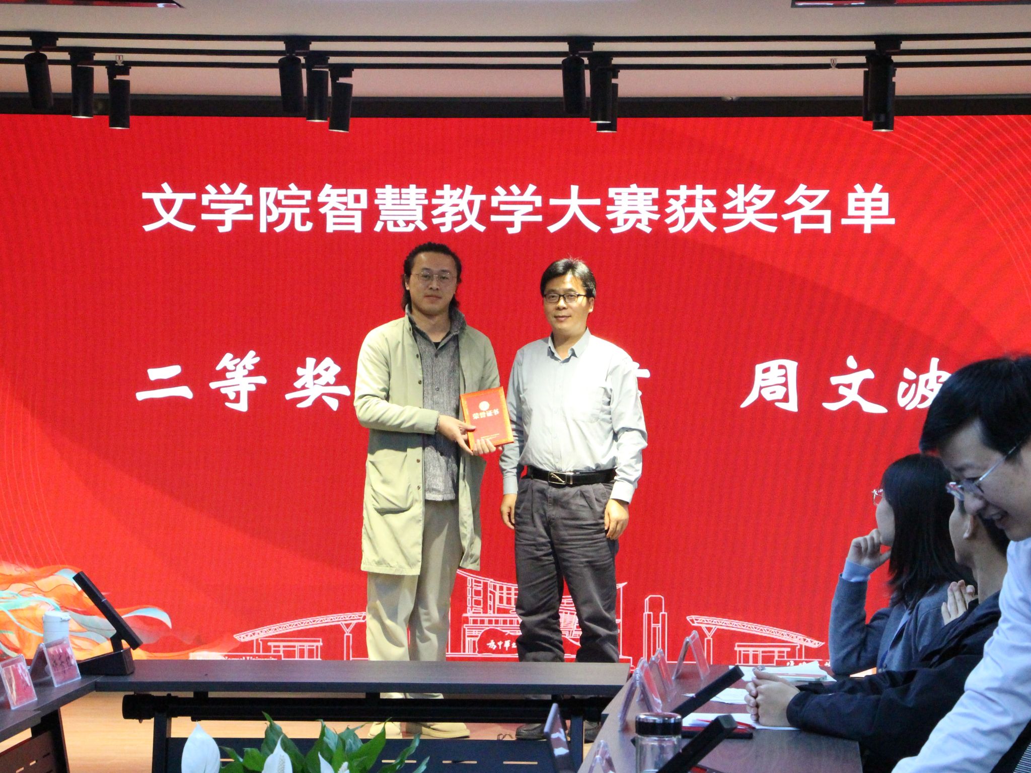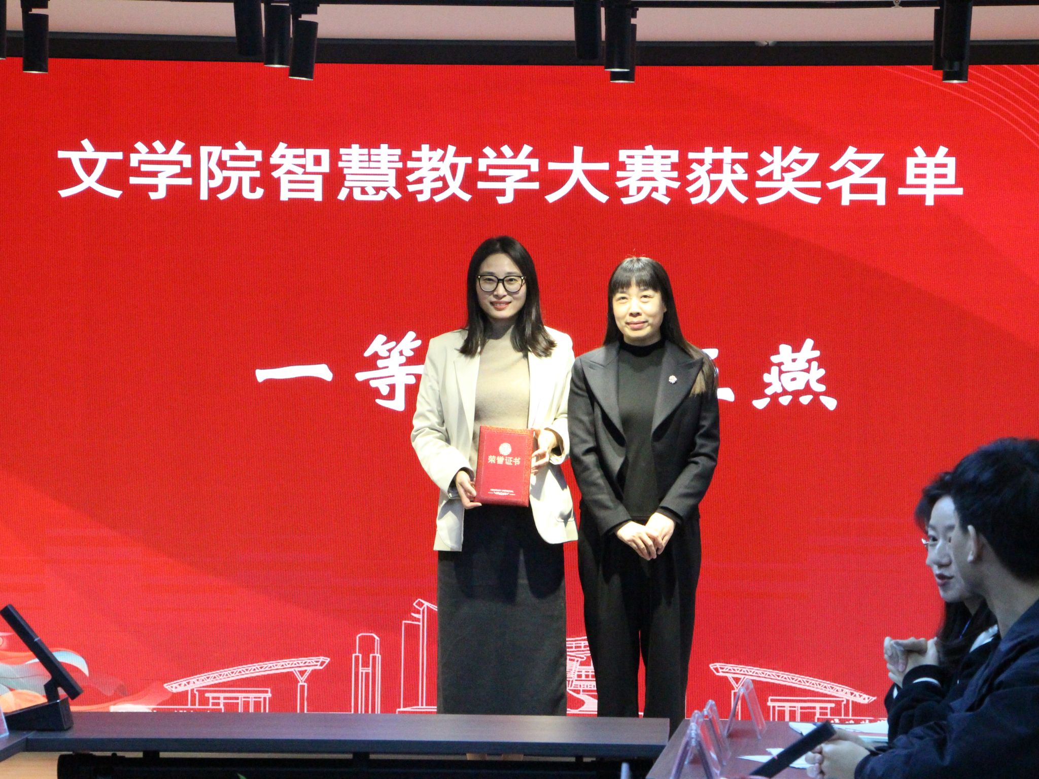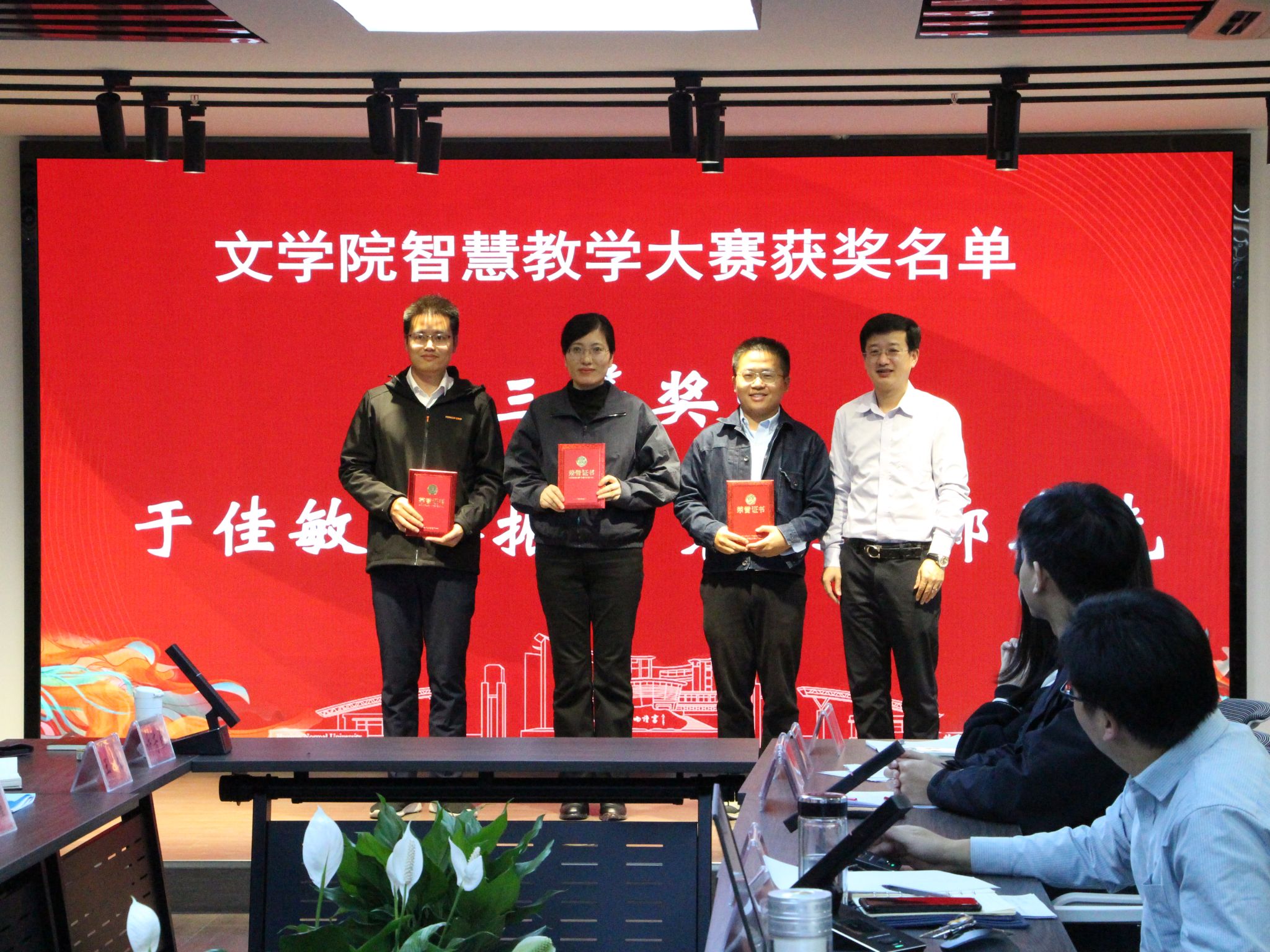 会上,公司领导为在各级各类智慧教学大赛中获奖的青年教师举行了颁奖仪式并合影留念。