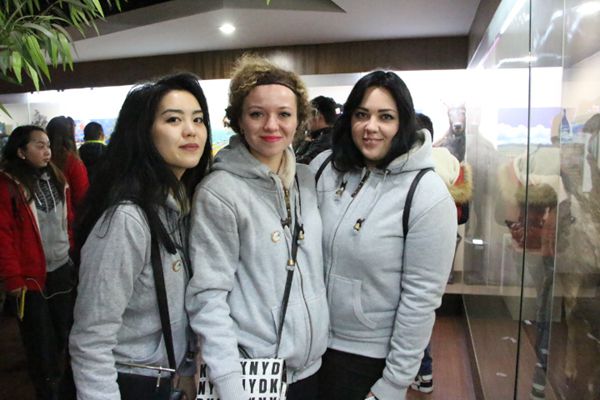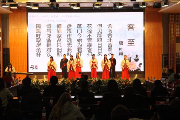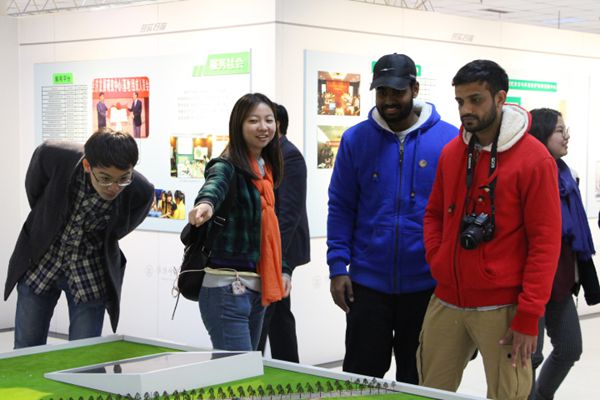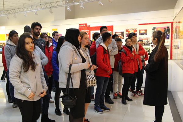 来自21个国家的职工身着红、蓝、灰三色上衣与来访的领导、老师以及公司师生在图书馆门口合影纪念,盛才强一行在周军的陪同下参观了校史馆、生科院标本室、教科院手工产品展示室,并观看了体育公司的舞狮、武术和健身气功表演。此后,职工们在图书馆多功能报告厅欣赏了由必一运动采菊诗社带来的古诗词吟诵等节目,并受赠了由必一运动文创中心出品的 “西游记”主题纪念品。为了进一步加深职工对我国传统文化的了解,必一运动汉语国际教育专业的同学和职工三两搭档进行中国结、剪纸等手工艺品的创作,在同学们的细心讲解下,职工聚精会神发挥创意,做出了不少精致的作品。一名来自俄罗斯的女员工表示这是非常有特色的纪念品。