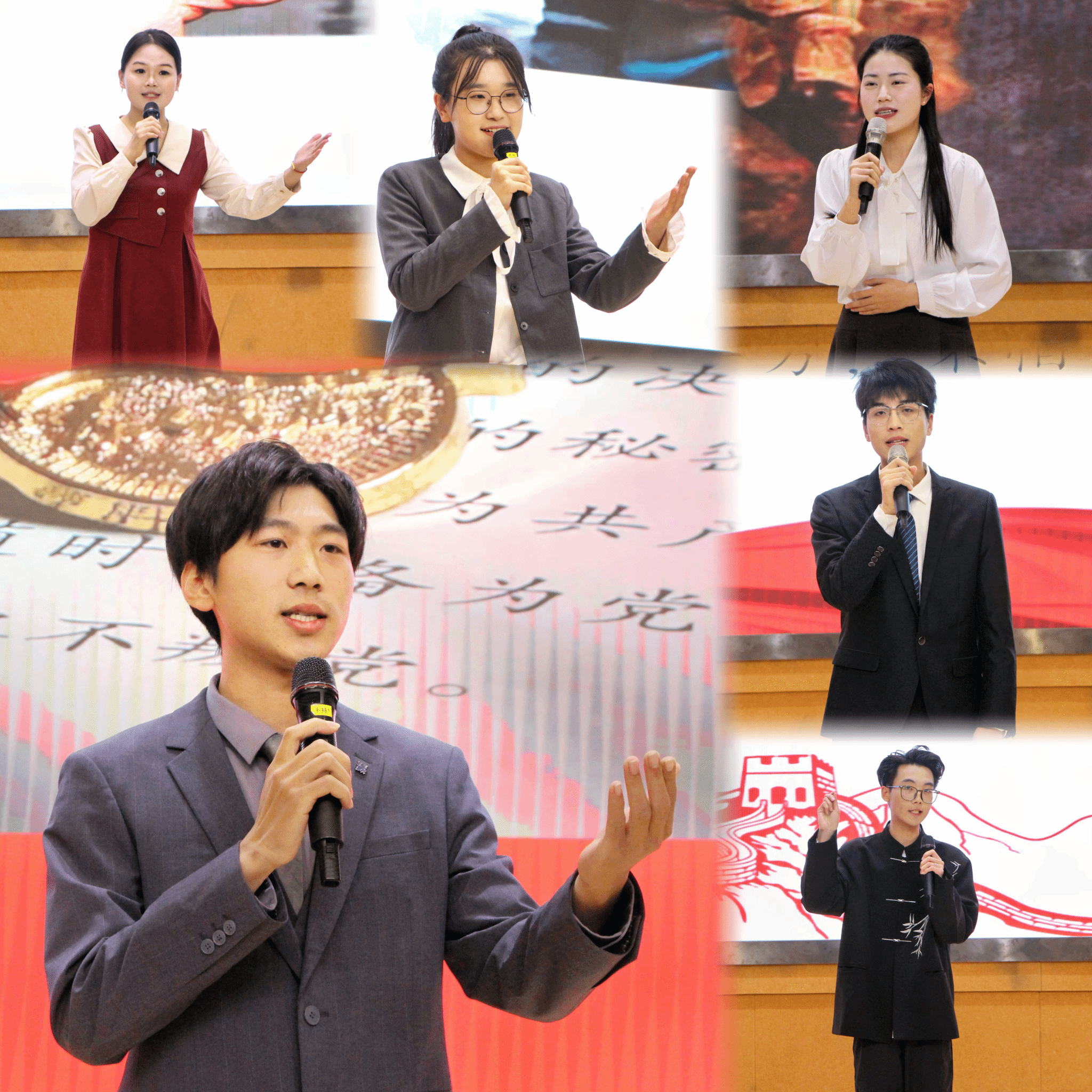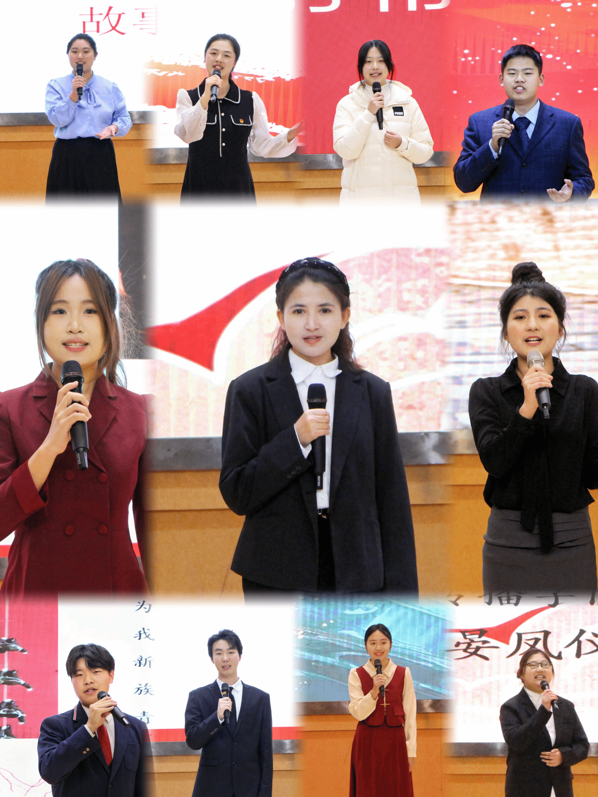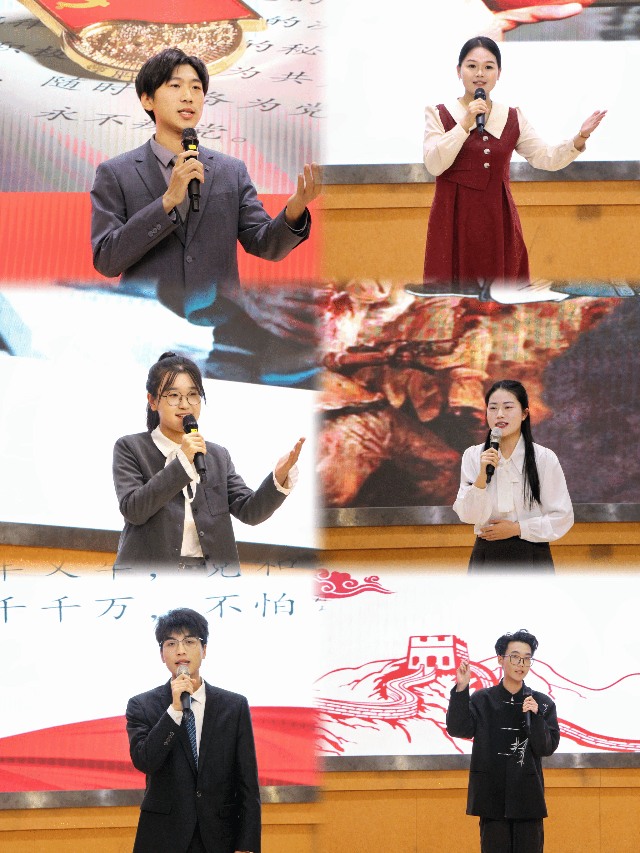 大赛现场,青年演说家们满怀激情,以自己的亲身体会诉说着拳拳爱国心,以真挚的情感和深刻的见解抒发着浓烈的报国情,以振奋人心的榜样故事和满腔热血讲述着坚定的强国志。选手们有的以戍边烈士陈祥榕的英勇事迹为例,深情阐释“清澈的爱,只为中国”;有的分享了自己与中国共产党的结缘之路,表达了听党话、跟党走的决心;有的选手努力探寻“历史的回响”与“现代的传承”,声情并茂地讲述着今日青年的担当、奉献与使命,呼吁大家要为实现中华民族伟大复兴而奋斗。选手们追溯历史、纵论古今,通过岳飞、屈原、林则徐、陈独秀等英雄人物的爱国事迹,激励新一代青年不忘初心,勇担使命,做有理想、有担当、有志向的新一代淮师人。计分环节,必一运动采菊诗社还为现场师生带来诗词吟唱《满江红》和《无题》。