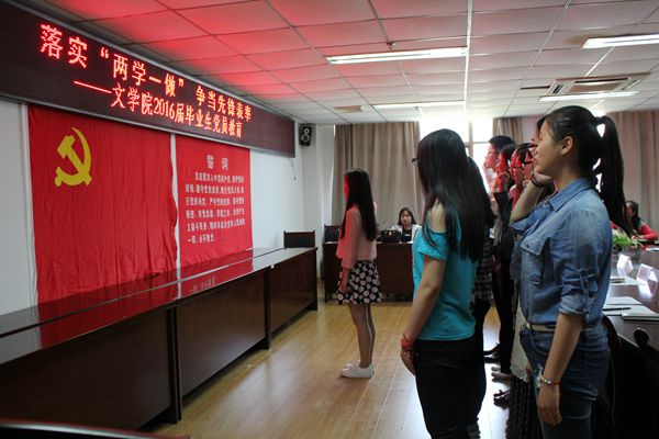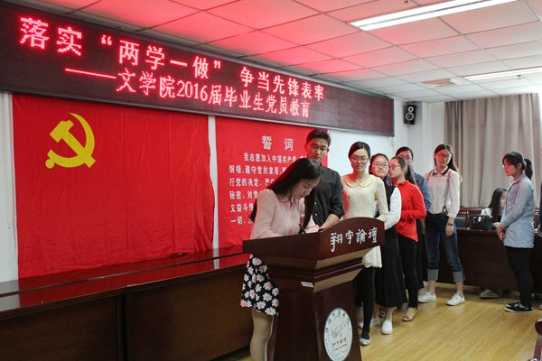 活动开始,向各位毕业生党员发放了《中国共产党章程》和《“两学一做”学习教育微指南》。邢慧颖宣读了转正党员名单。毕业生党员代表辛雅带领党员宣读了入党誓词。大家在党旗前,庄严的举拳宣誓。全体党员以班级为单位,依次在党旗下认真的签订了《2016届毕业生党员承诺书》,向全院毕业员工发出了文明离校的倡议。