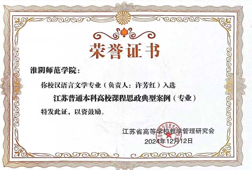 汉语言文学专业为国家一流专业、江苏省品牌专业。该专业以立德树人为根本任务,利用以周恩来为代表的地方红色文化资源,厚植家国情怀;挖掘专业课程中华优秀传统文化精神,涵养文化精神;打造独具特色的实践教育活动品牌,蕴润教育家精神。通过“课程思政年”建设,一体化推进课程思政建设;进行“更生班”建设,打造教育家型教师培养示范模板和品牌;举办课程思政教学案例比赛,形成课程思政教学资源库;举办课程思政教学大赛,打造高水平课程思政示范课程;进行课程思政教学改革,探索专业教育融入课程思政的有效路径;打造具备课程思政教学能力的教师团队,探索出课程、教学、资源、活动、团队全融入的课程思政立体化建设路径,建构了“三元主导,五维驱动”课程思政教学体系,课程思政特色鲜明,具有育人效度。