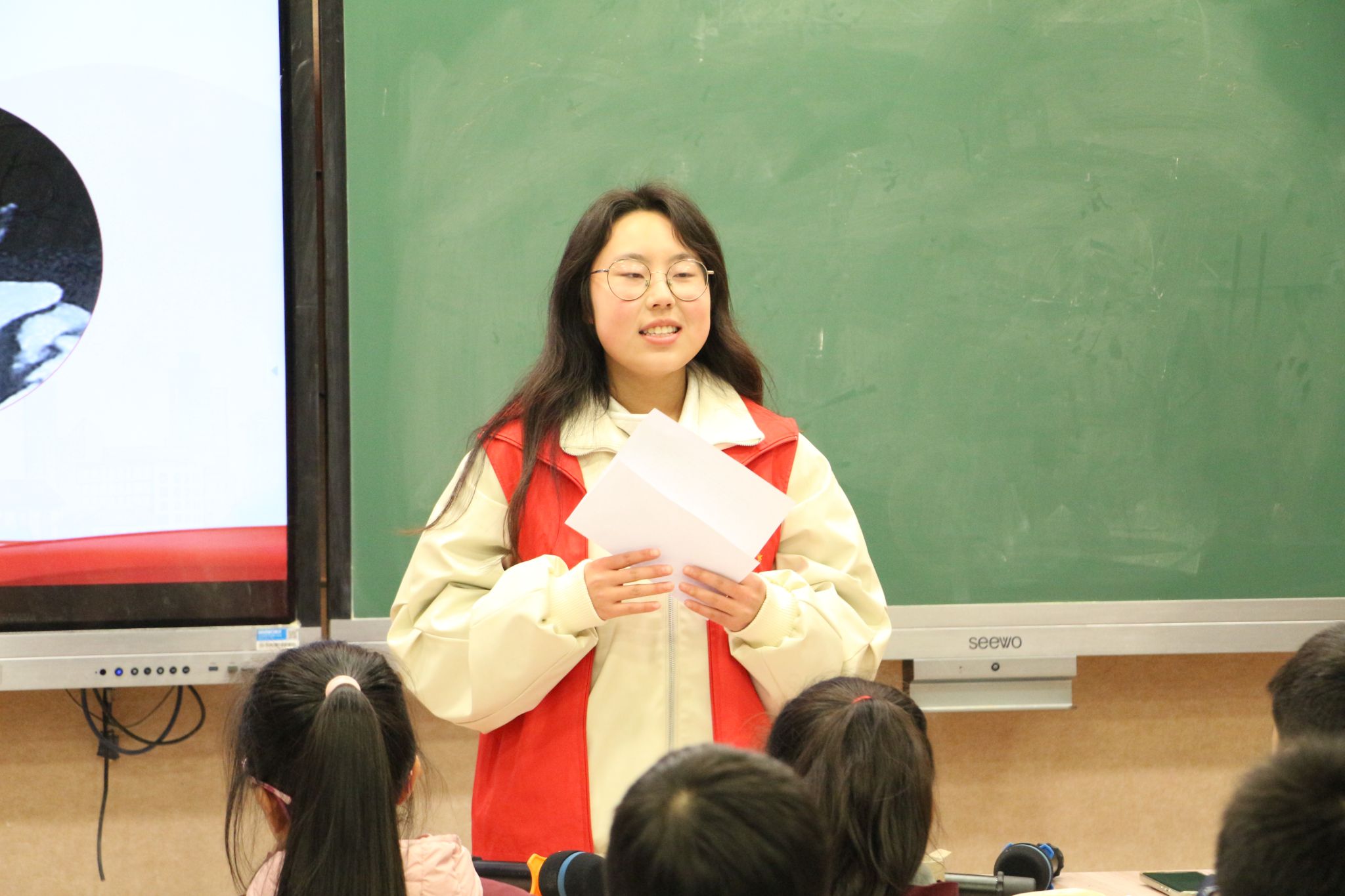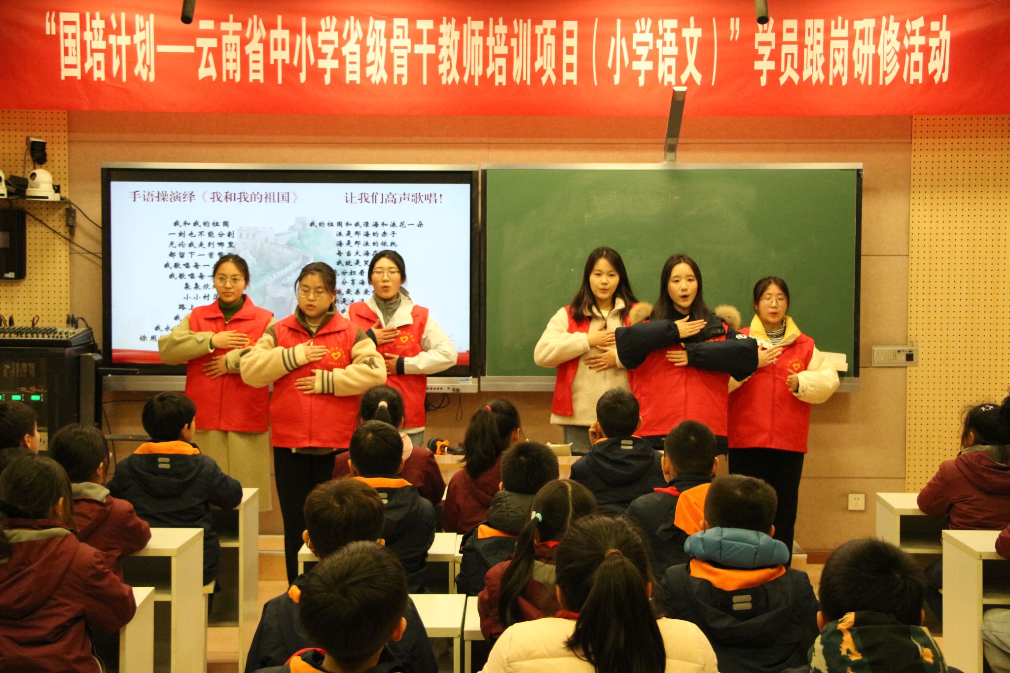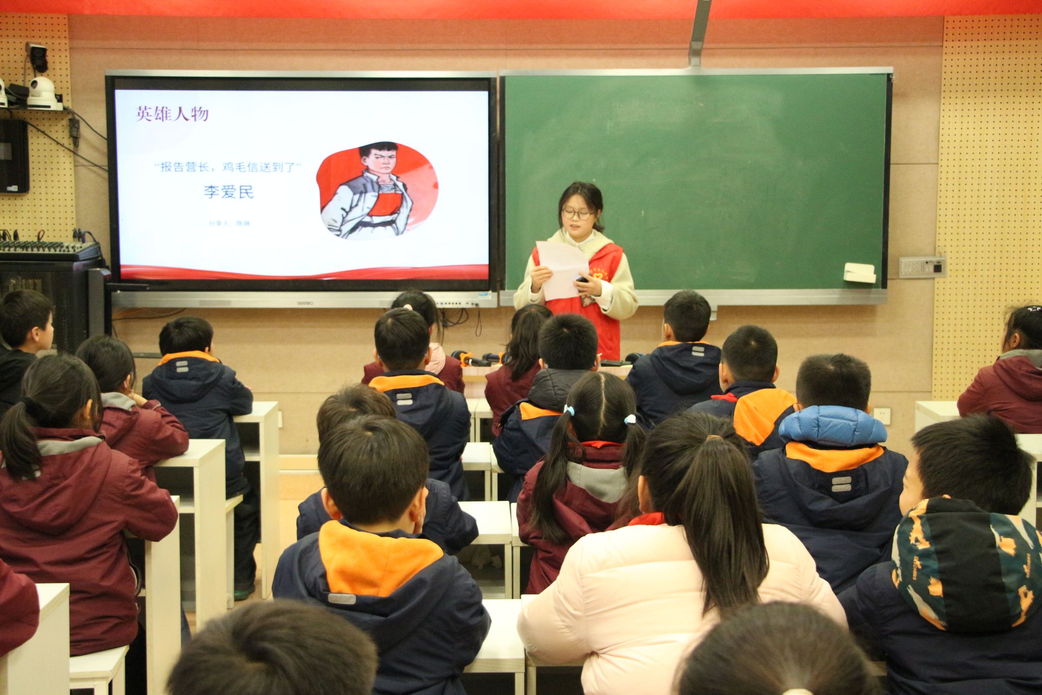 “同学们请看黑板,大家知道这是什么历史事件吗?”宣讲伊始,志愿者杨鑫雨循循善诱,带孩子们走进那段刻骨铭心的历史,用精美的课件、经典抗战影视作品、通俗易懂的语言将相关知识娓娓道来。在孩子们的殷殷期待中,志愿者一一上台,讲述了抗日小英雄的事迹,赢得台下孩子们的共鸣与掌声。随后,六名志愿者倾情演绎手语操《我和我的祖国》,台下的孩子用清脆的童声合唱,伴着悠扬的歌声,表达了对革命先烈的崇敬之情和对当今和平生活的热爱。