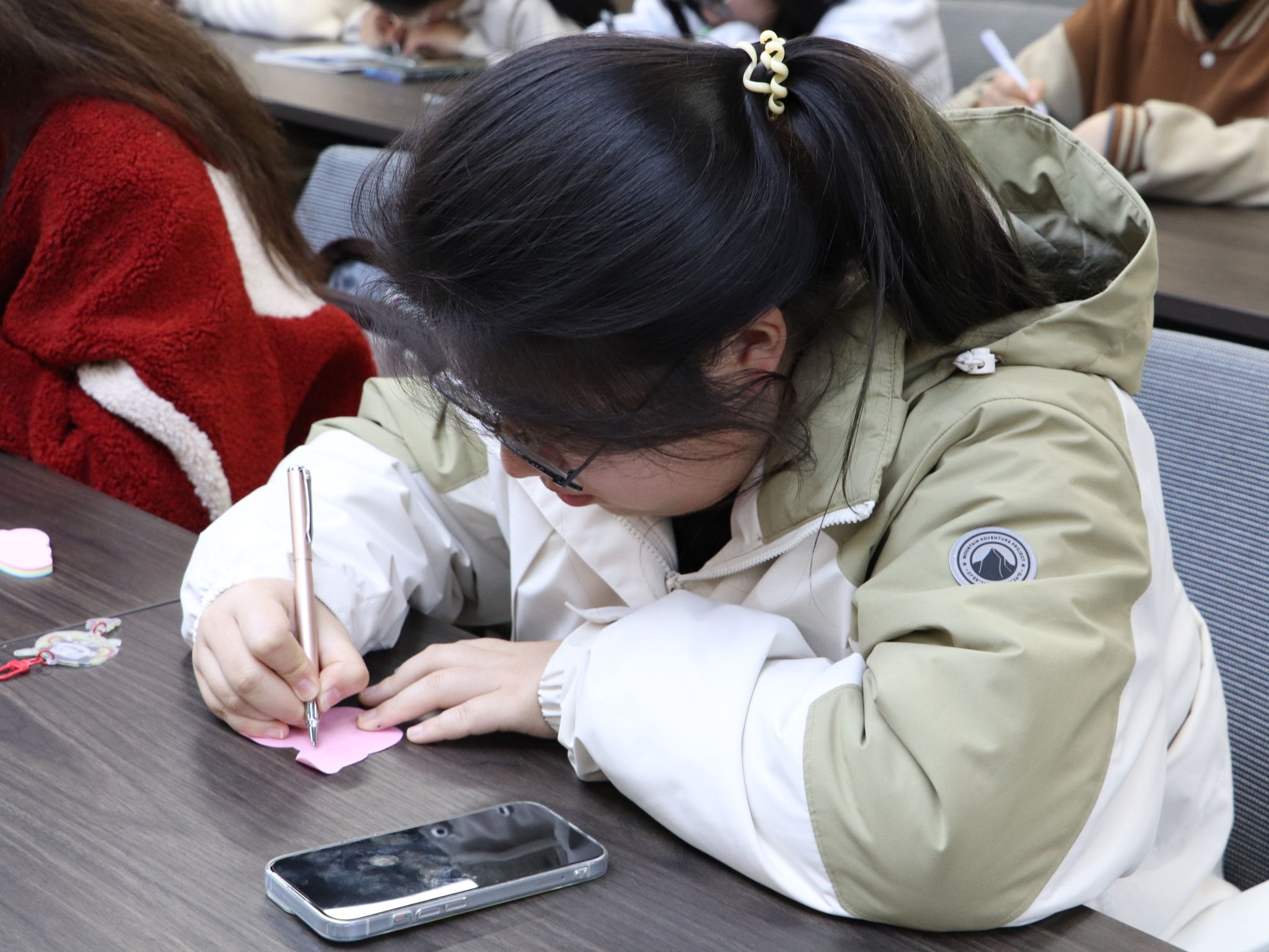 “凝旧照时光 让爱意绽放”分享环节,2304班许欣怡、2308班郑蕊蕊和2403班王子晶三位同学分享了与亲人的老照片,动情地讲述了背后的亲情故事与成长感悟,令人动容。大家在便利贴上写下对家人的感恩寄语。当一张张承载着感恩与祝福的卡片被温情呈现时,爱与成长的力量已悄然在春日夜晚萌发。