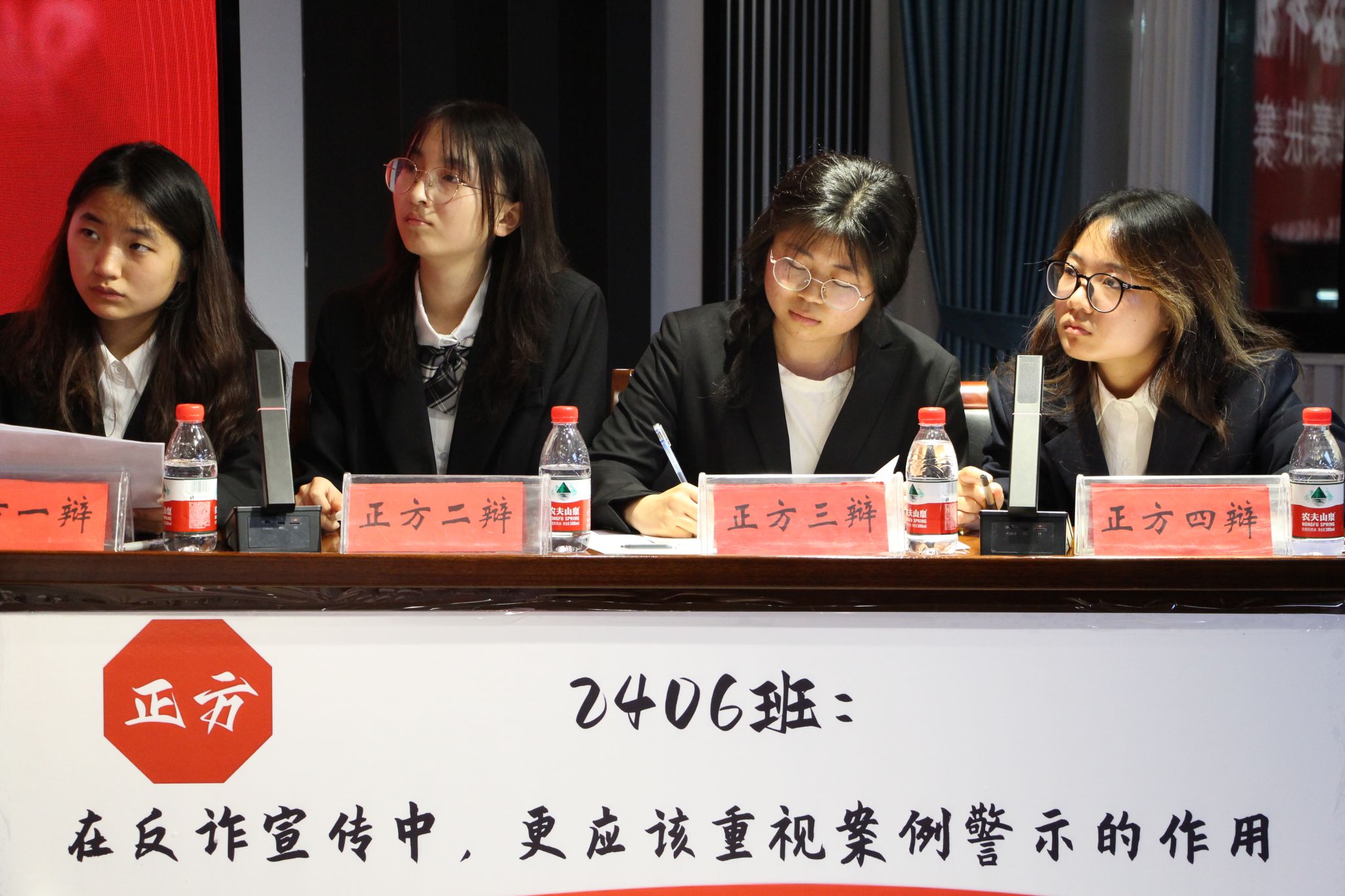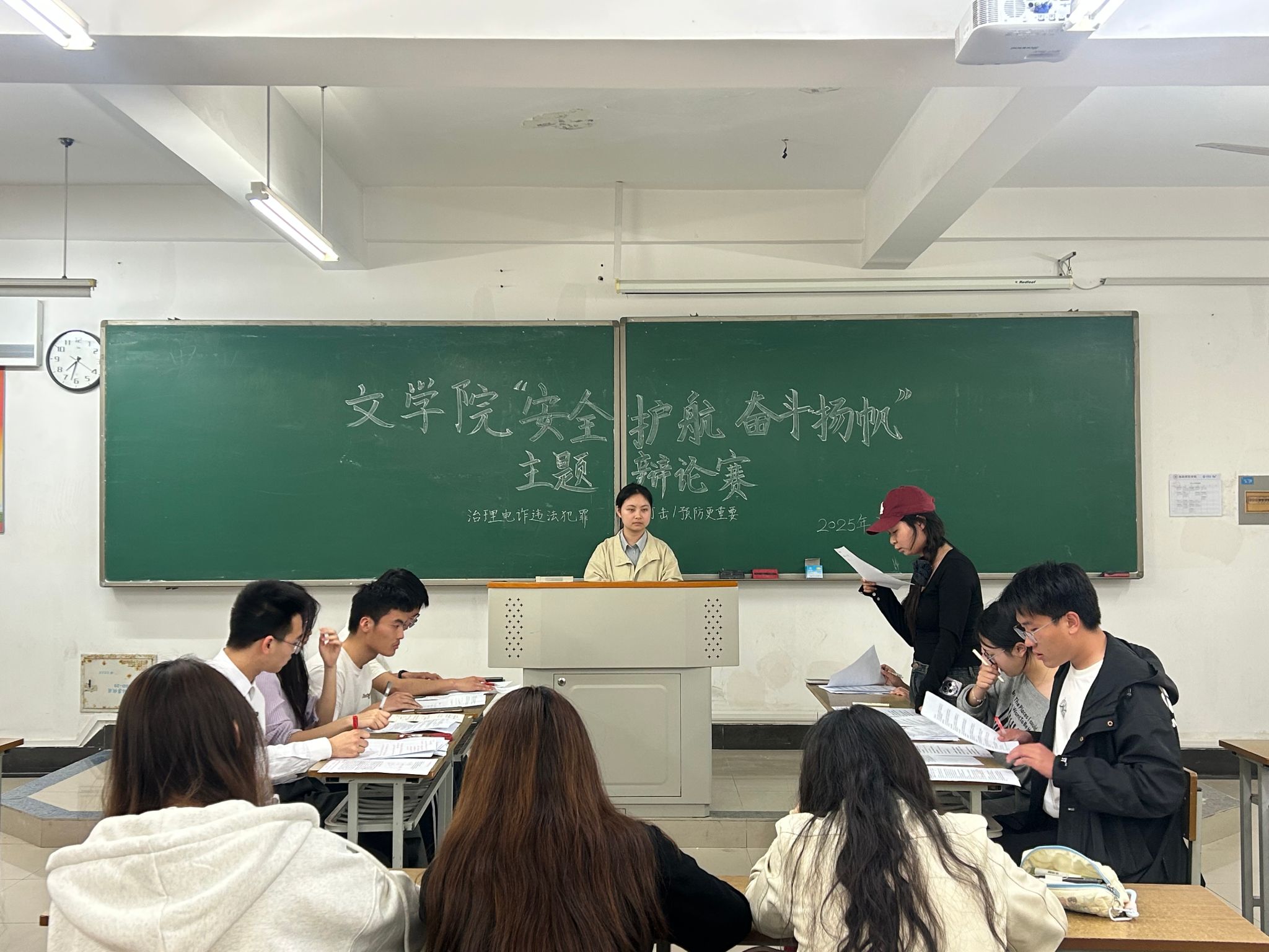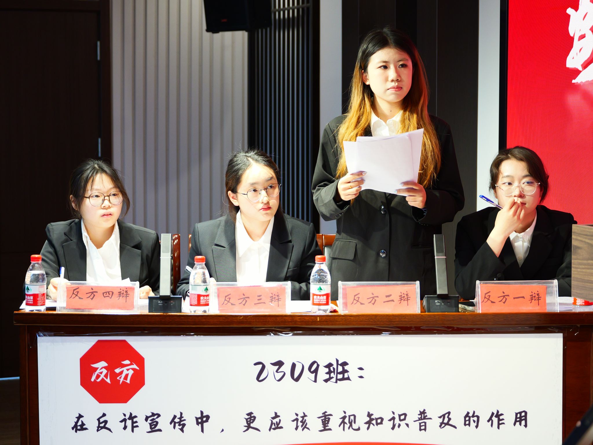 经过初赛、复赛的层层选拔,2406班、2309班代表队进入决赛。本次辩论赛的辩题为“在反诈宣传中,更应该重视案例警示/知识普及的作用”,正方2406班与反方2309班围绕这一辩题展开激烈交锋。开篇立论环节,正方切入主题,以“AI换脸诈骗”“冒充公检法”等新型诈骗手段为例,强调案例警示可打破公众侥幸心理;反方则强调知识普及的系统价值,提出通过传授“身份验证四步法”“反诈话术识别”等底层逻辑知识,能帮助公众解析诈骗话术,从源头降低受骗风险。自由辩论环节,双方援引各项数据与多个案例激烈对垒,将辩论推向高潮。