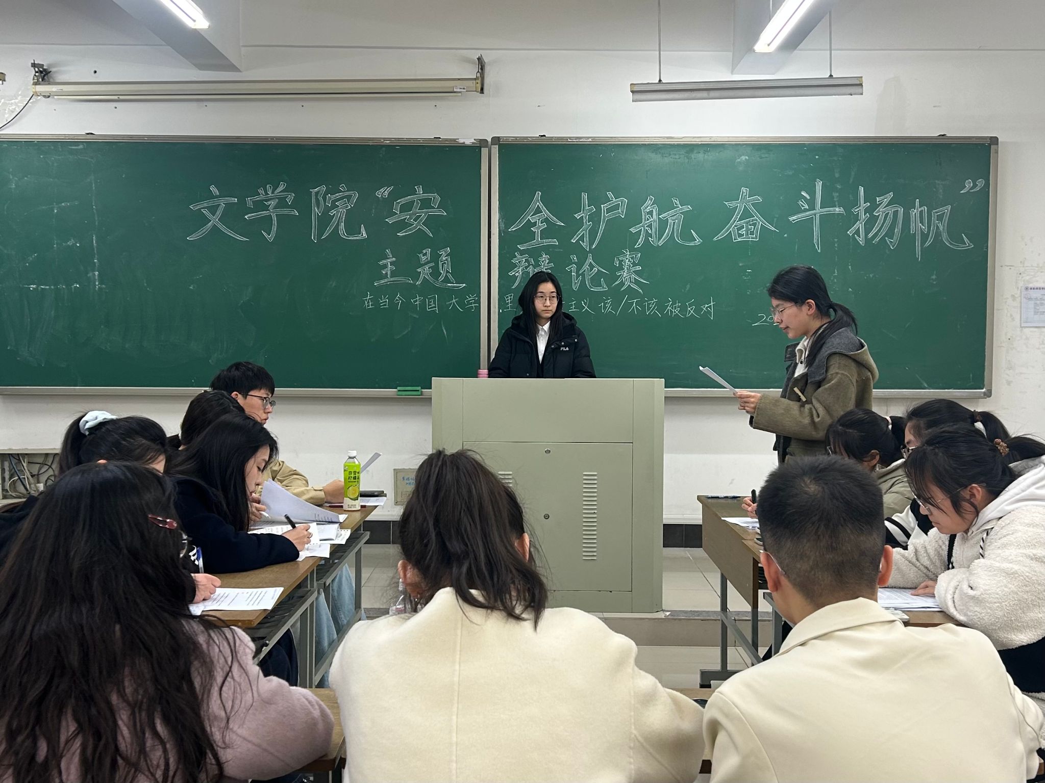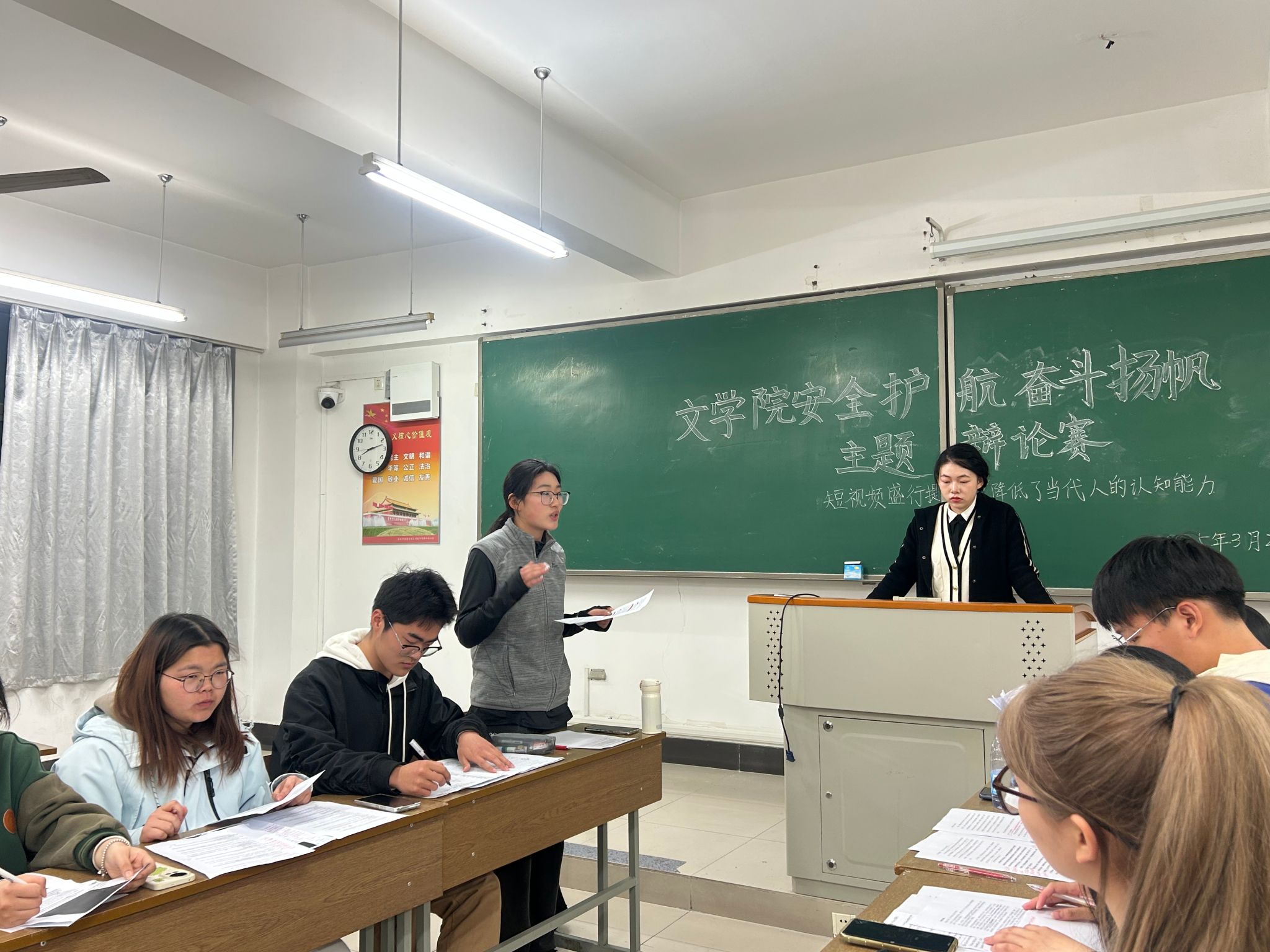 双方辩论结束后,张浩、张宇翔分别对本次辩论赛进行点评。张浩指出了双方在辩论过程中的不足之处,提出“升华立论”“抓住对方的逻辑漏洞”等建议;张宇翔结合自身经验,建议辩手增加与评委、观众的互动交流,跳出稿件束缚,展现更自然的思辨风采。经过评委认真评判,正方2406班以3:1获胜,2406班仲秀妍和2309班王岩荣获“优秀辩手”称号。