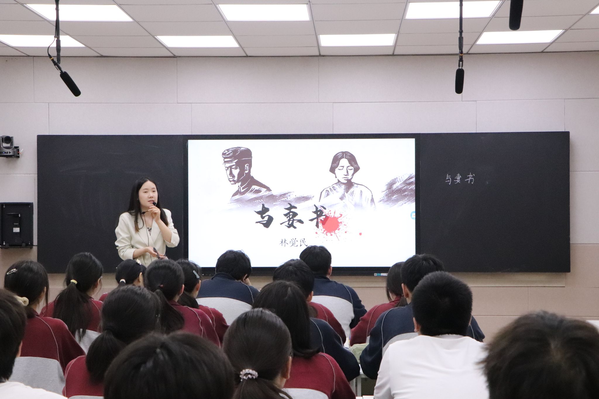 活动伊始,葛周青老师带来林觉民《与妻书》语文教学观摩课。葛老师设定了巧妙的情境任务,以江苏省淮安中学筹备制作《素笺铁血 致敬英雄》纪念册为切入点,要求员工协助完成《林觉民——柔情诉别意,壮志许山河》的专题内容。教学中设计“初读感知,判断书信性质;读文品人,体会林觉民的柔情与壮志;对话先烈,撰写回信”三项任务,引导员工深入体会林觉民的英雄气节与革命情怀,课堂氛围活跃有序,尤其是在课程结束时,员工在宣誓声中结束课程,巧妙地将思政教育融入语文教学,增强了员工对革命文化的认同感。