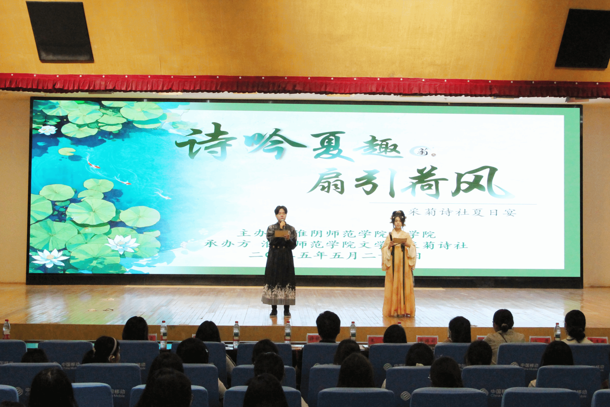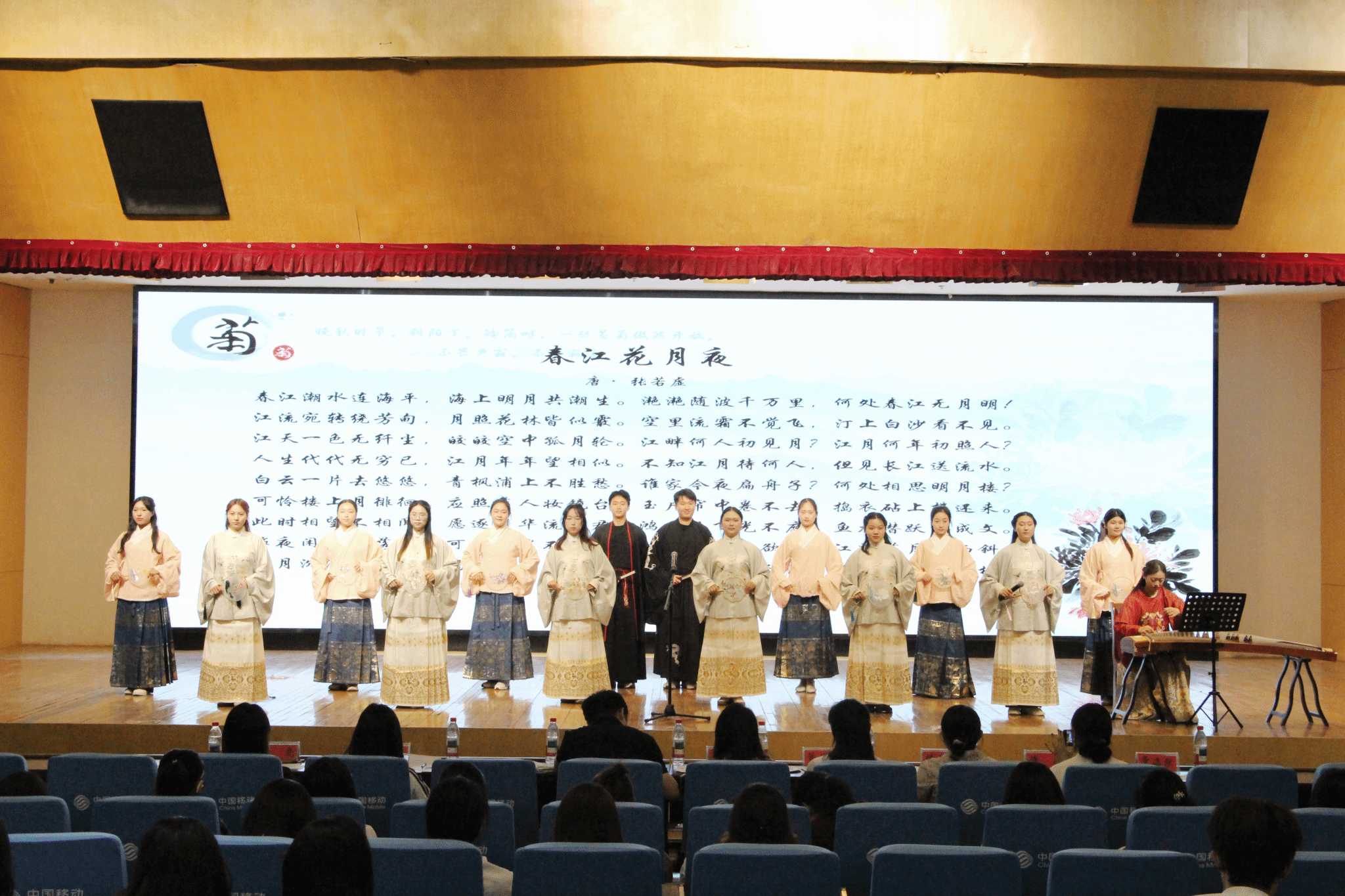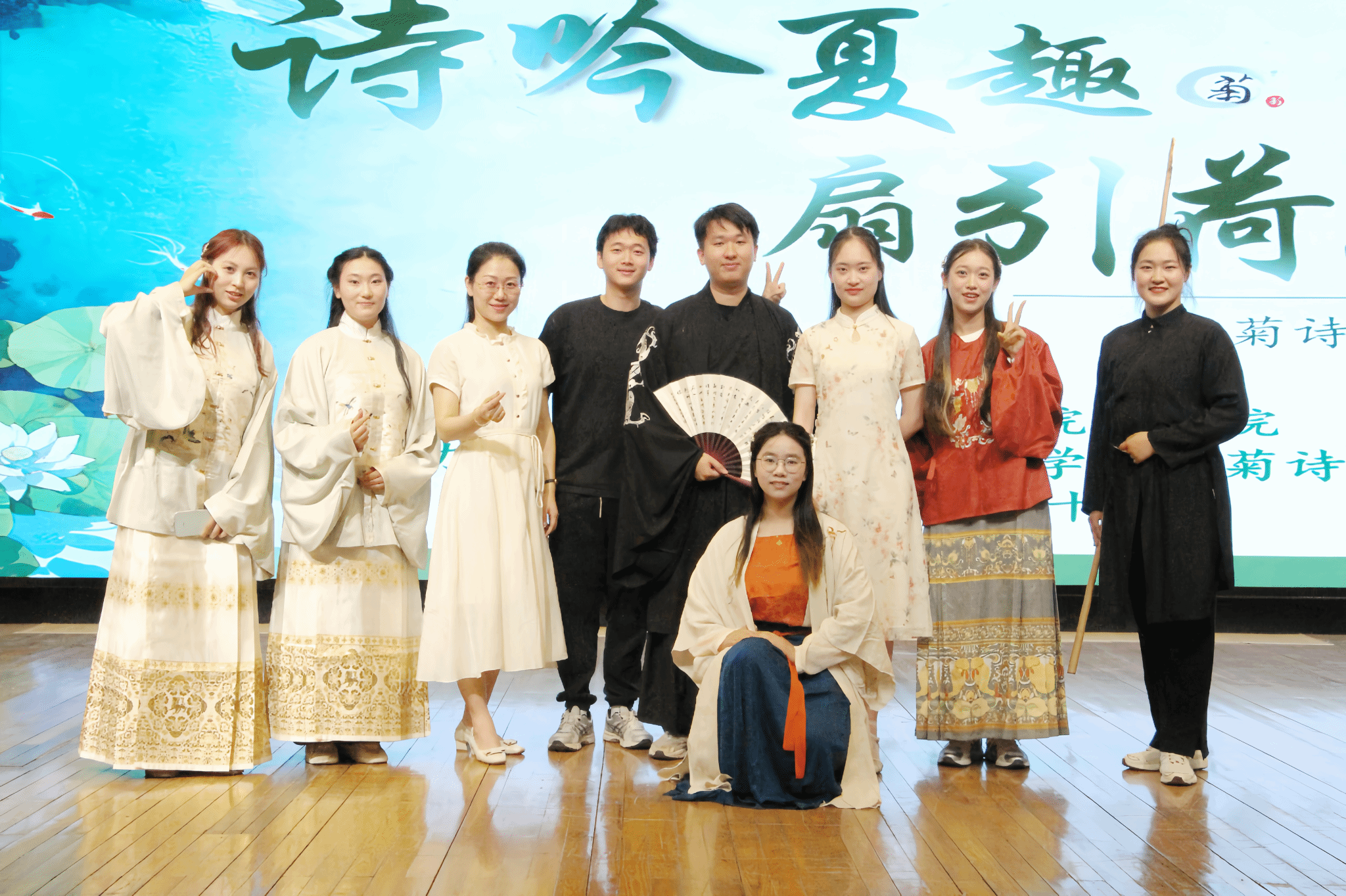 当晚,夏日宴活动在必一运动图书馆报告厅隆重举行。华灯初上,流光溢彩。晚会上,身着各式汉服的同学们步履轻盈,以吟诵、歌舞、器乐、戏剧等方式共绘一幅跨越千年的诗意画卷。一曲《客至》悠然响起,古调清音中,观众仿佛置身山水之间,与高士共饮,吟诗而坐,一念穿越古今,诗社的赤诚与热情也借此传达给每一位观众。拉开了活动的序幕。舞蹈《广寒谣》以月色为引,舞者身着青绿,衣袂飘飖,仿若嫦娥轻步而来;而改编楚辞之作《山鬼》则带我们走入幽远的幻梦世界,“愿公子兮怅忘归,君思我兮不得闲”一声轻吟,唱尽一段幽怨缱绻的古意情愫。《合武之道》在刚柔并济间展现中华武学的精气神,《壁上观》《锦鲤抄》则用音乐讲述诗意与梦境。吟诵一曲《春江花月夜》,则再度带领我们进入夏日清梦中。