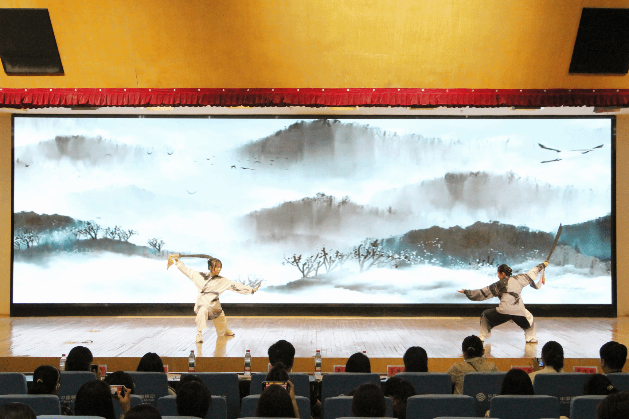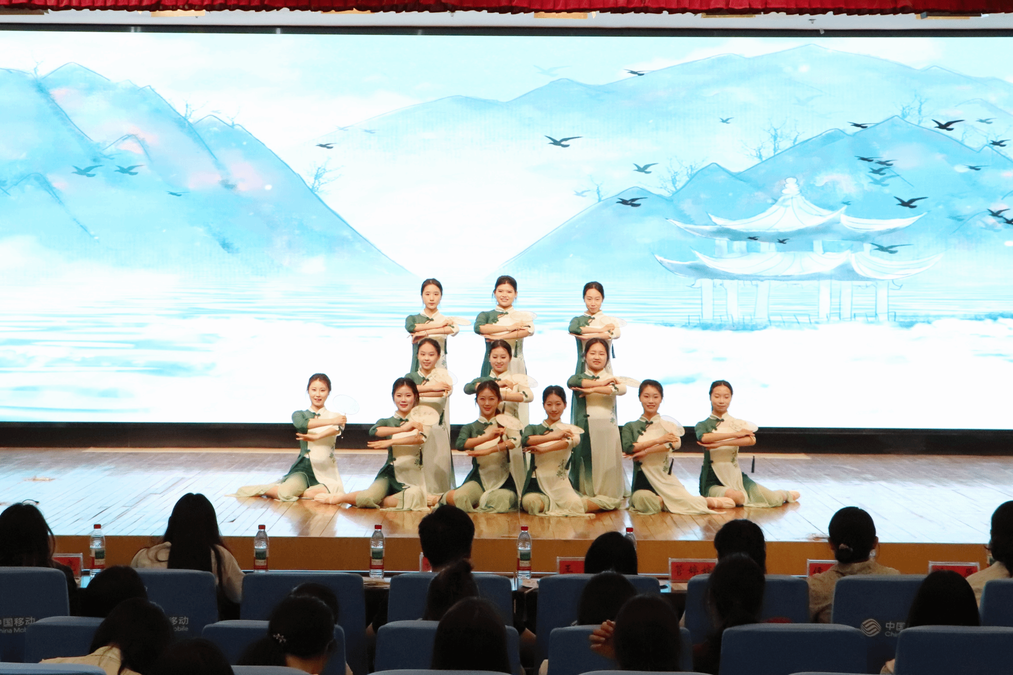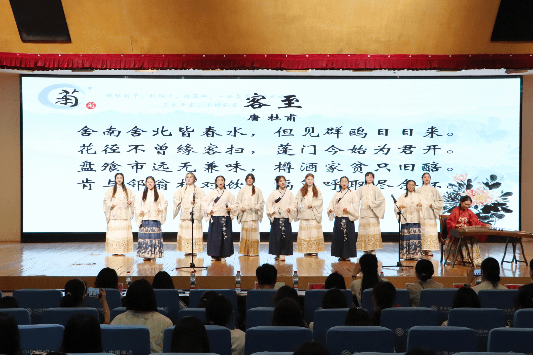 当晚,夏日宴活动在必一运动图书馆报告厅隆重举行。华灯初上,流光溢彩。晚会上,身着各式汉服的同学们步履轻盈,以吟诵、歌舞、器乐、戏剧等方式共绘一幅跨越千年的诗意画卷。一曲《客至》悠然响起,古调清音中,观众仿佛置身山水之间,与高士共饮,吟诗而坐,一念穿越古今,诗社的赤诚与热情也借此传达给每一位观众。拉开了活动的序幕。舞蹈《广寒谣》以月色为引,舞者身着青绿,衣袂飘飖,仿若嫦娥轻步而来;而改编楚辞之作《山鬼》则带我们走入幽远的幻梦世界,“愿公子兮怅忘归,君思我兮不得闲”一声轻吟,唱尽一段幽怨缱绻的古意情愫。《合武之道》在刚柔并济间展现中华武学的精气神,《壁上观》《锦鲤抄》则用音乐讲述诗意与梦境。吟诵一曲《春江花月夜》,则再度带领我们进入夏日清梦中。