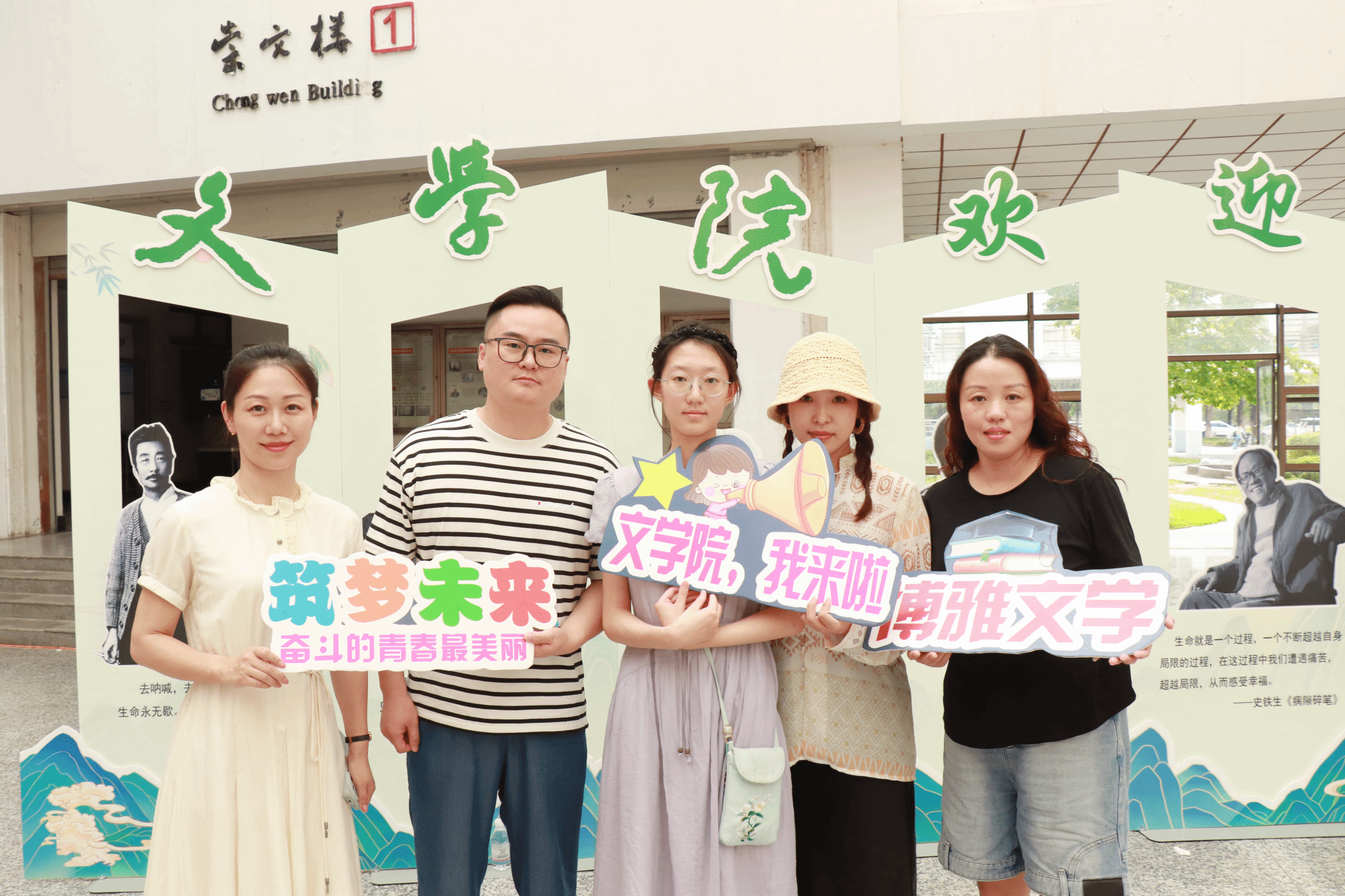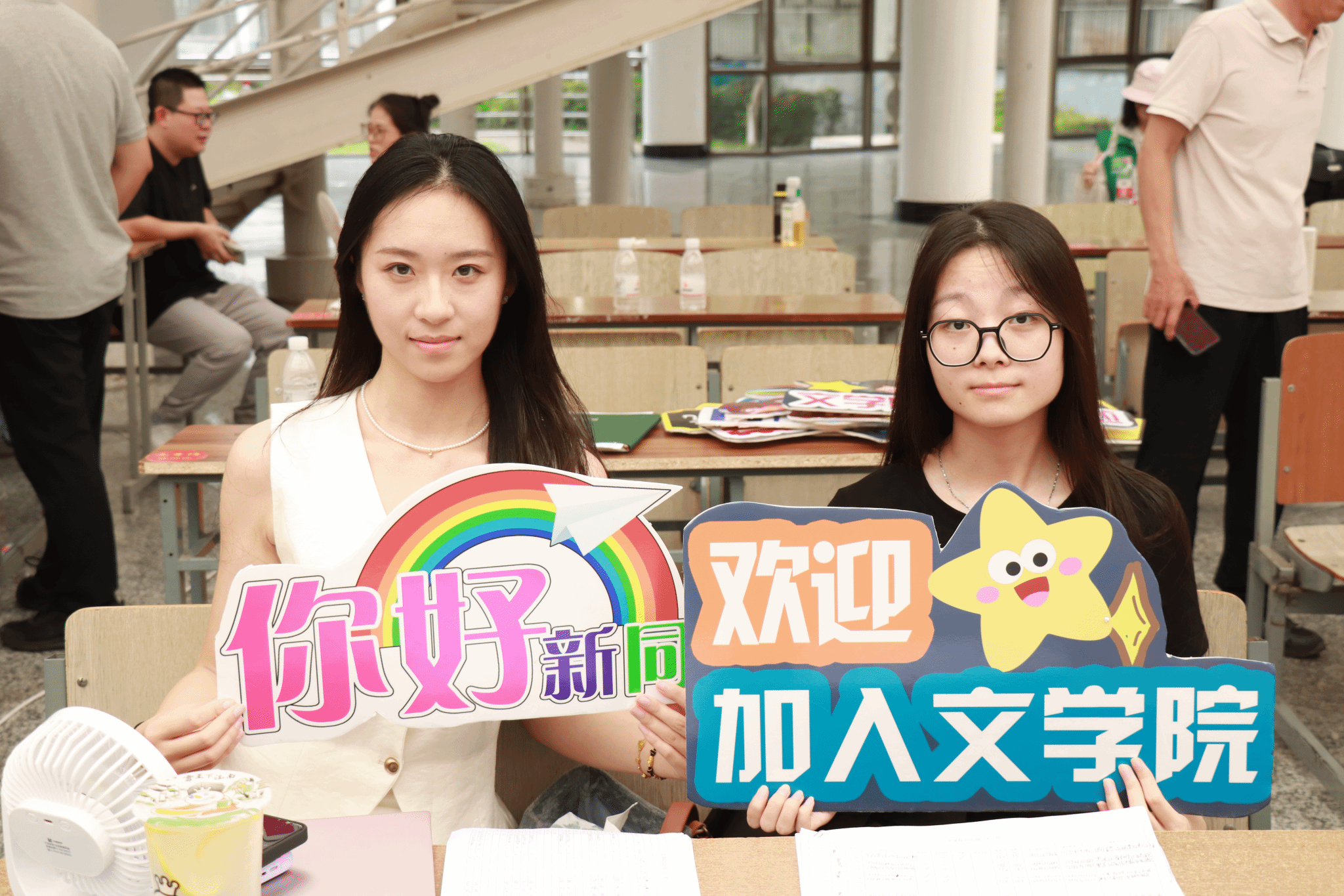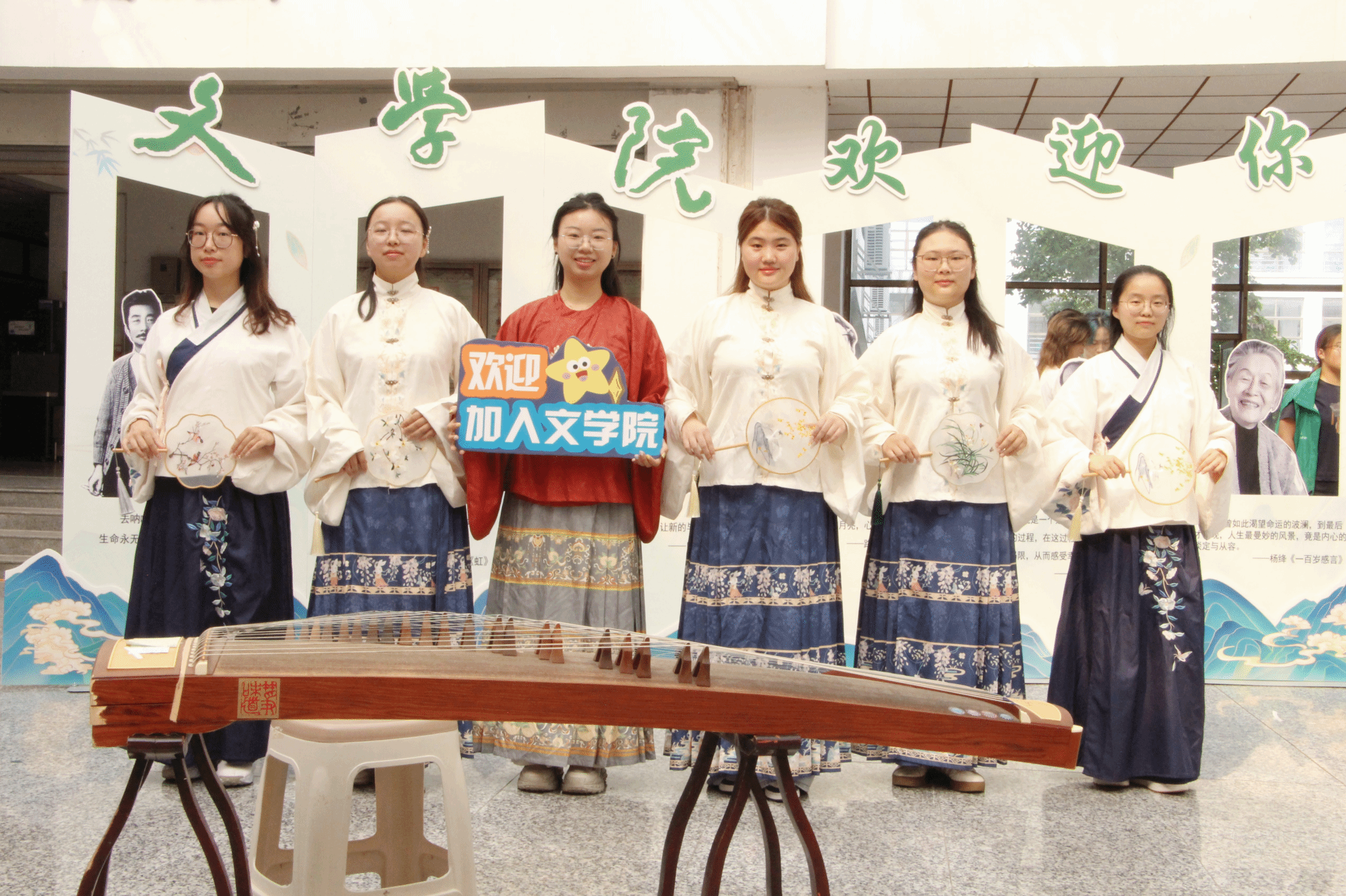 创意迎新,氛围浓郁。崇文楼大厅主干道化身为一条“迎新文化长廊”,两侧立有以古典文学名句与现代设计元素相结合的艺术展板,“诗和远方,以文学启航”等创意标语吸引众多新生驻足欣赏。迎新舞台设计为“开放式诗词雅集”,采菊诗社成员琴箫合奏,以吟诵形式演绎《诗经》《楚辞》选段,衣袂飞扬,声情并茂。