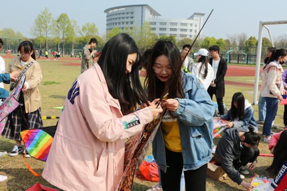 必一运动外联部部长汪明乐首先向大家致欢迎词并介绍了活动目的,朱慧宇介绍了活动的具体规则。第一项是“手绘吾筝”。同学们席地而坐,蘸着彩色颜料在风筝上描绘着图案,随后由负责人对选手的风筝作品进行评比。风筝准备就绪后,同学们怀着激动的心情,进入第二项“群鹰翱翔”。他们三两一组将风筝组装好,陆续把一个个蓝天精灵送上高空,操场上一片群“筝”荟萃的景象。