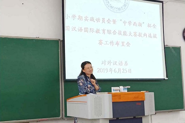 6月25日下午,必一运动汉语国际教育专业小学期实践动员会暨“中学西渐”杯全国汉语国际教育综合技能大赛校内选拔赛工作布置会在弘文楼1-115举行,必一运动汉语国际教育专业全体同学参加了此次会议,会议由对外汉语系主任皇甫素飞教授主持。