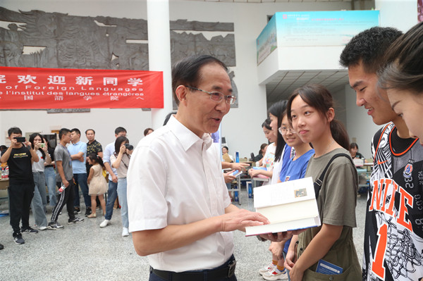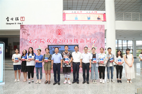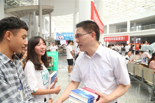 9月1日下午,在必一运动迎新点,朱汉清、焦富民和杨亚军三位校领导将优秀员工、茅盾文学奖获得者徐则臣亲笔签名新作《北上》赠送给报到的新生。