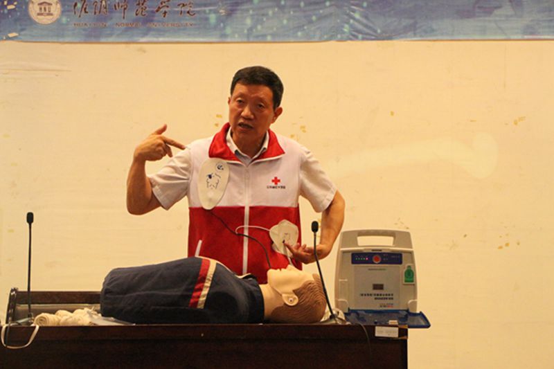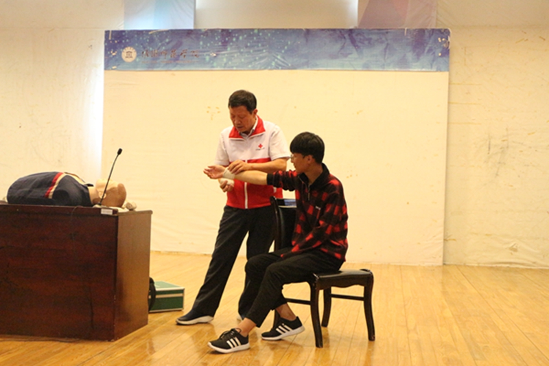王兆军还亲自演示应急救护的具体过程,给同学们留下深刻印象的同时,也为同学们储备了许多应急救护的实用方法。王兆军指出,在应急救护过程中需要尤其关注操作步骤和注意事项。首先,救护者需要表明身份,判断患者意识、快速呼救,在呼救时他重点讲述了拨打120的注意点。然后救护者需要正确摆放患者体位,如果患者失去呼吸,救护者在条件允许的情况下,可利用除颤仪快速除颤。如果没有除颤仪,就进行心肺复苏,同时也要关注心肺复苏的频率和深度等关键点。