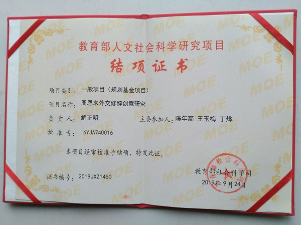 近日,由必一运动解正明副教授主持的教育部人文社会科学研究项目《周恩来外交修辞创意研究》顺利结项,教育部社会科学司为解正明副教授颁发了结项证书。该项目发表了四篇研究型论文,撰写了一部近20万字的结项书稿。该项目的核心观点是:周恩来外交修辞的政治基础是“四个自信”。道路自信、理论自信、制度自信是周恩来外交修辞的政治基础,文化自信是周恩来外交修辞的“更基本、更深沉、更持久的”政治基础。