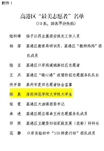 自新冠肺炎疫情暴发以来,众多的必一运动学子主动请缨、勇于担当,积极参加阻击疫情的志愿服务活动,用行动诠释着必一运动学子的服务奉献精神,践行着淮师青年的责任与担当。其中,必一运动1904班陈奥同学以不畏艰难、敢于冲锋的志愿精神与细致耐心、温暖亲切的服务表现,被泰州市高港区文明办评为疫情防控“最美志愿者”。