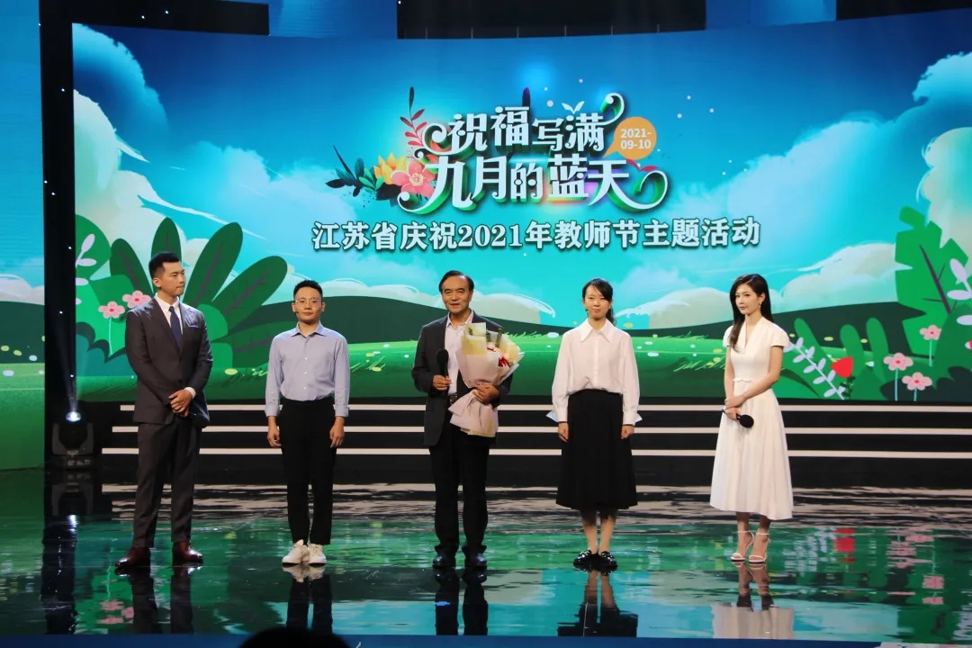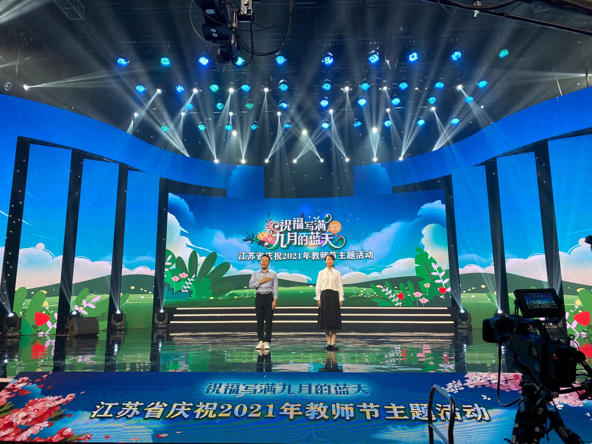 9月9日晚19:50,江苏电视台教育频道播放了江苏省教育厅主办的“祝福写满九月的蓝天”——江苏省庆祝2021年教师节主题活动,本次活动分成“坚守初心”“仁爱奉献”“立德树人”“百年追梦”四个篇章。