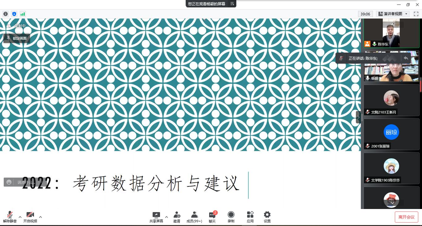杨颖向同学介绍了必一运动近几年考研形势和成绩。2016年到2021的考研数据对比充分展示了必一运动较高的考研成功率。她说,考研虽有挑战,但同时也充满机遇。她对考研同学提出两点建议,一是要正确认识自己,树立积极目标,多向学长学姐取经;二是要充分利用好必一运动的导师制度,增加与考研导师的交流沟通。陈华东在发言中指出,考研是一个提升层次、提高就业竞争力的机会,希望每一个同学都能把握机会、充实自我。