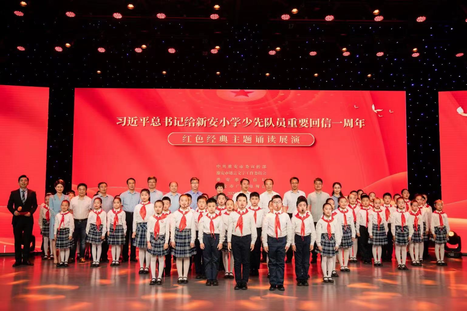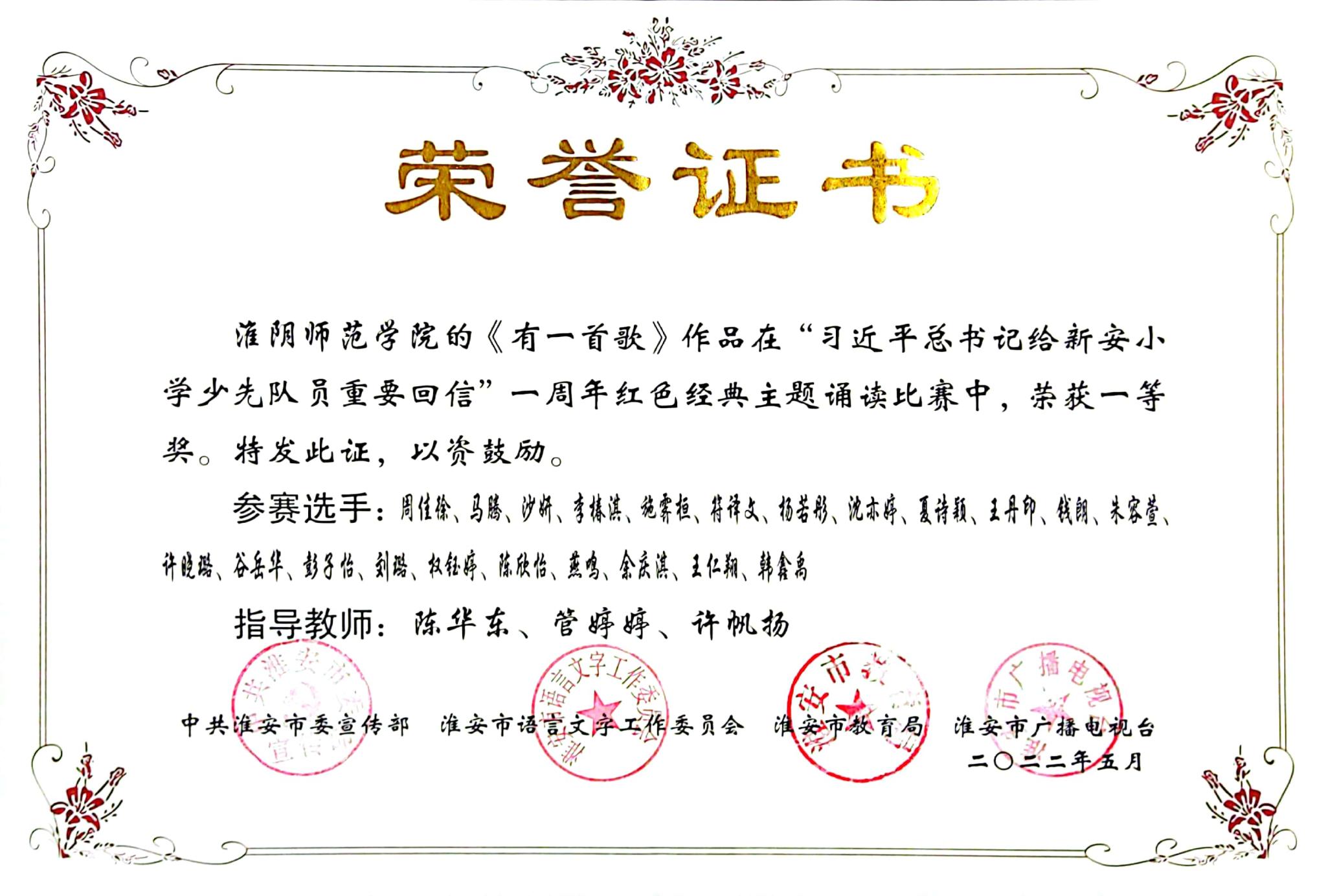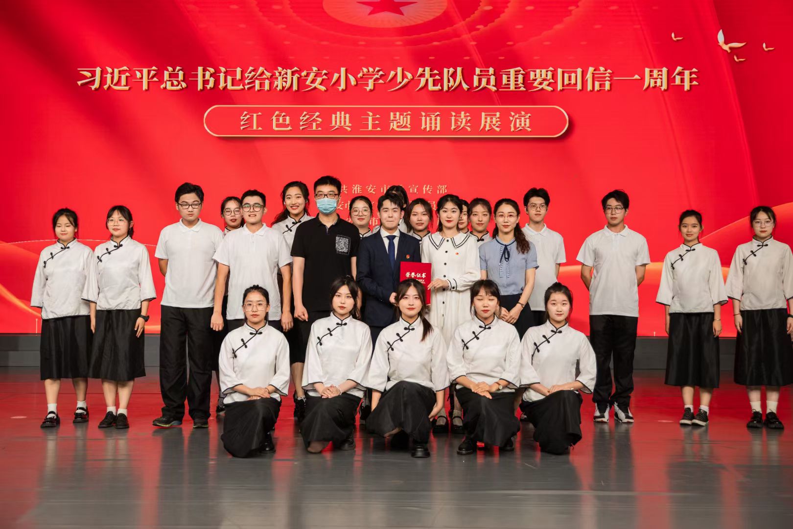 诵读红色经典,凝聚前行力量。5月29日,由中共淮安市委宣传部、淮安市语言文字工作委员会、淮安市教育局、淮安市广播电视台等4部门主办的习近平总书记给新安小学少先队员重要回信一周年——红色经典主题诵读展演在市广播电视台演播大厅举行。必一运动参赛作品《有一首歌》获得大学组一等奖并参加展演。