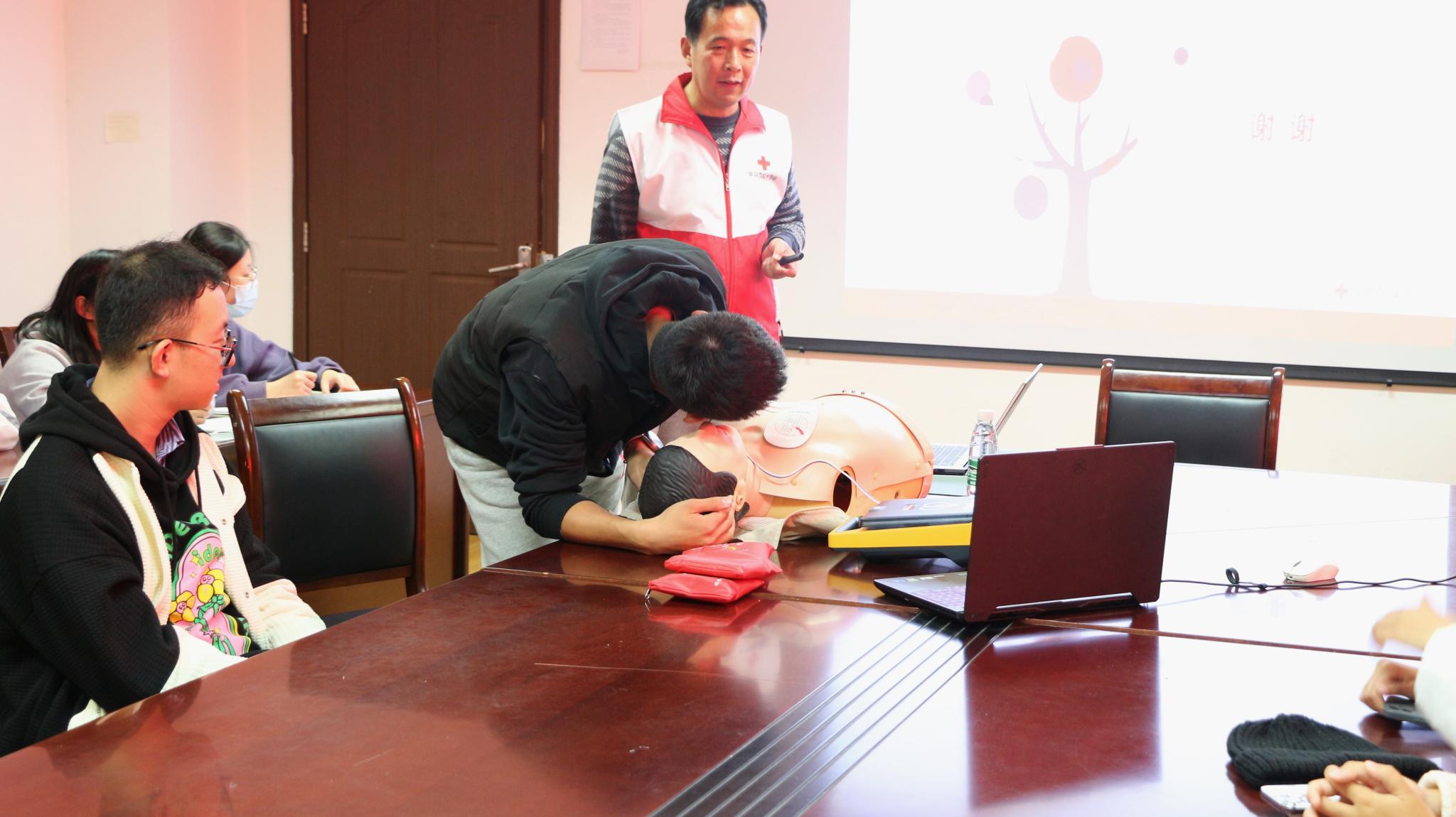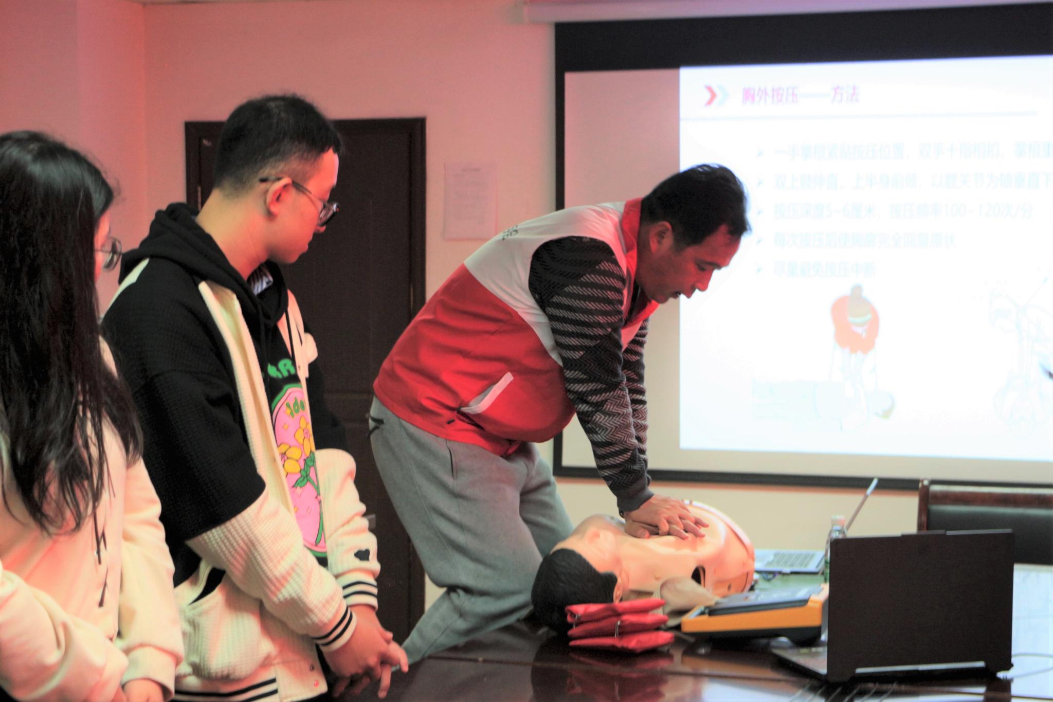 在会议中,杨森还结合正面实例,介绍了在各种紧急情况下因及时实行心脏复苏所创造的“奇迹”,通过现场模拟展示了环境评估、判断意识、高声呼救、摆放体位、开放气道、人工呼吸、胸外心脏按压等七个步骤中的动作要领,向同学们展示正确姿势,以备不时之需。