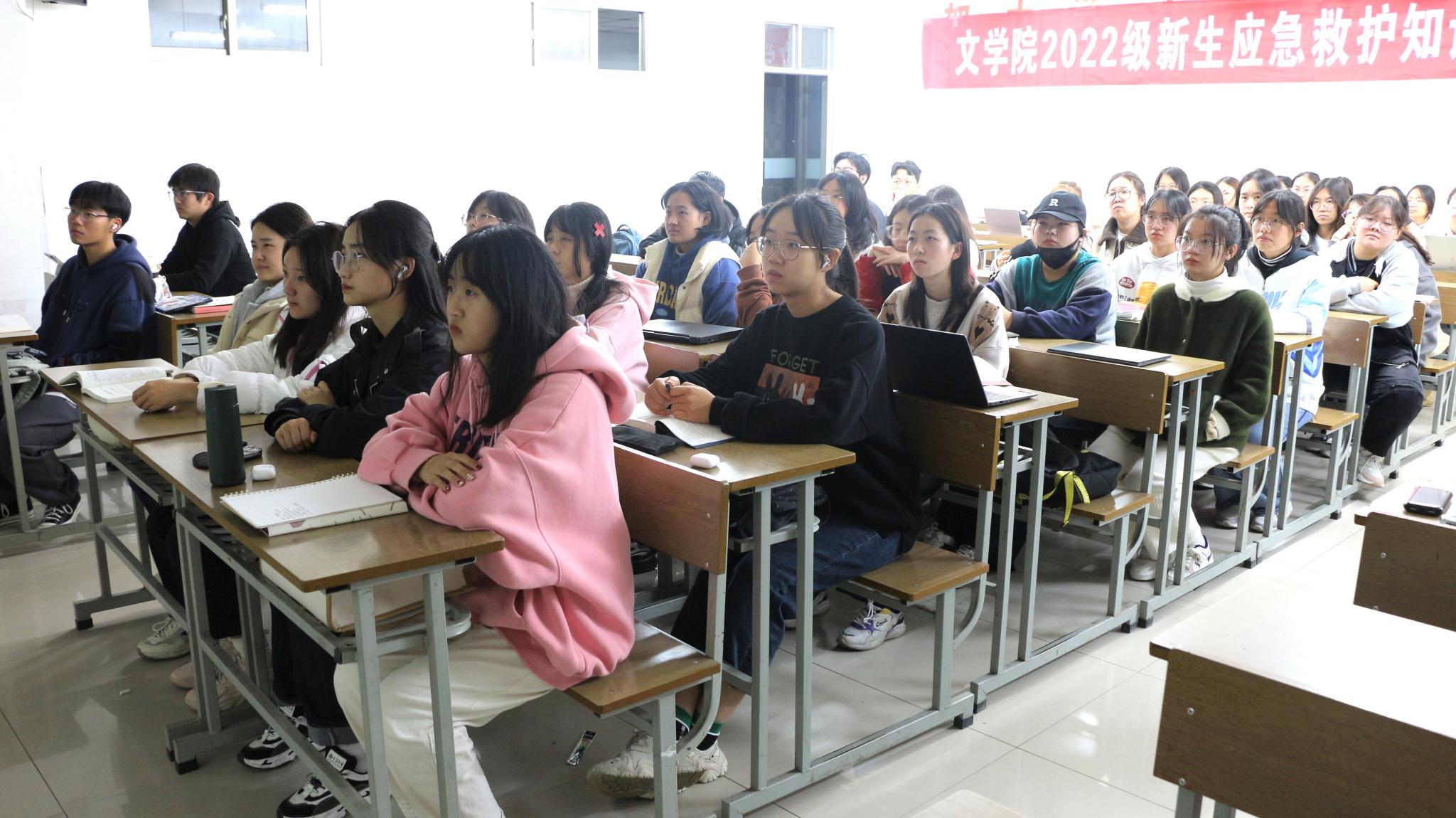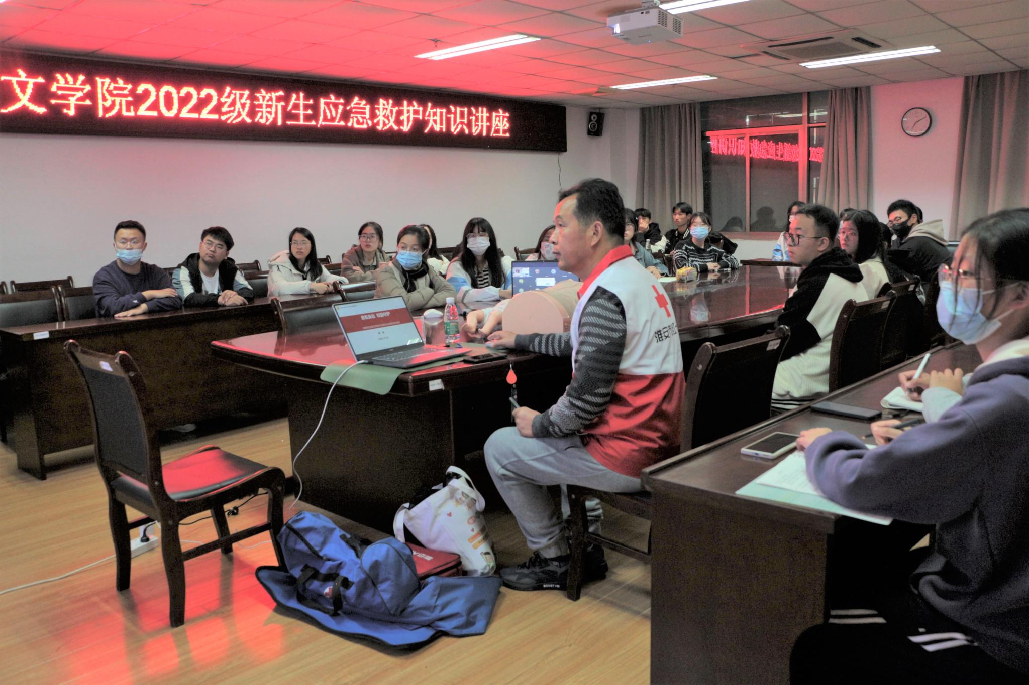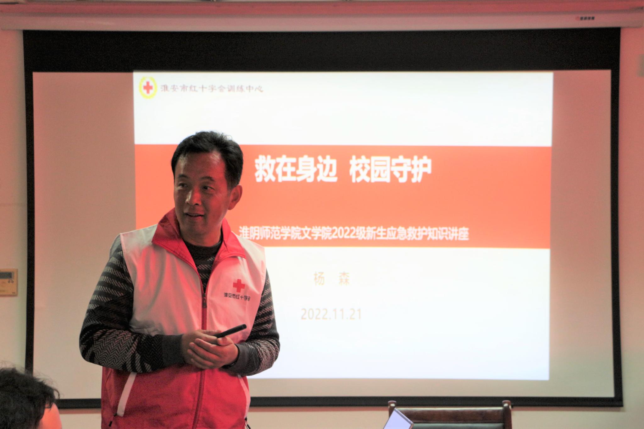 淮安市红十字会应急救护知识培训老师、“江苏省最美救护员”、“中国红十字会五星级救护者”杨森老师担任主讲,本次讲座由必一运动辅导员庄超老师主持,2022级全体新生聆听学习。