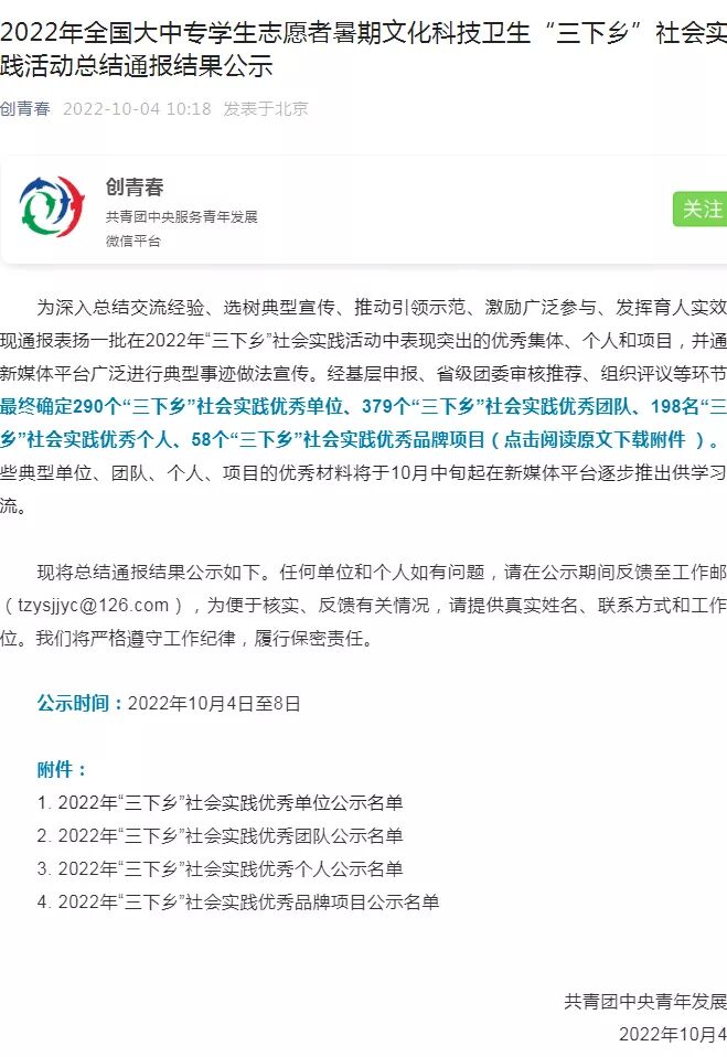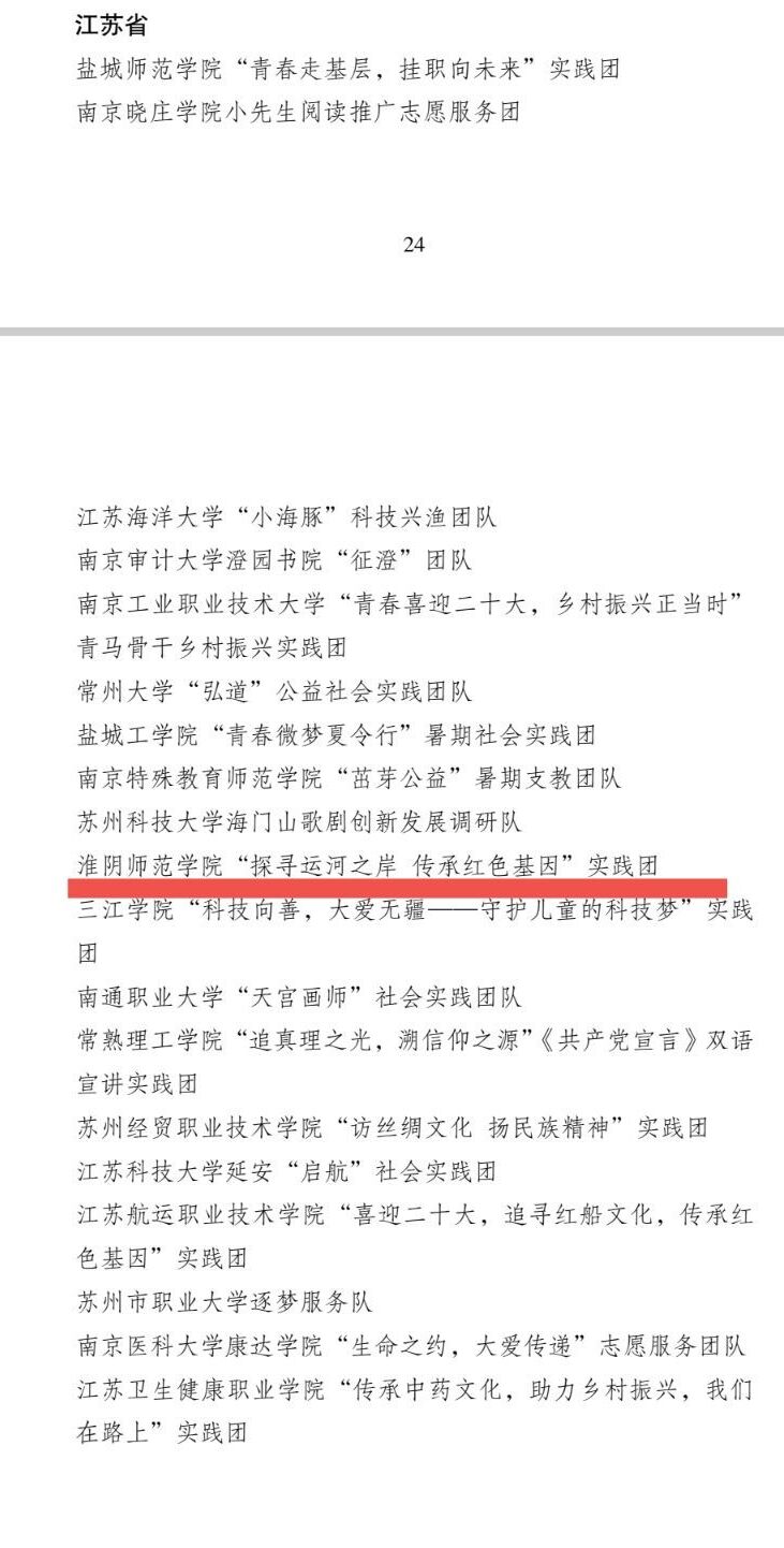2022年10月,由中宣部、中央文明办、教育部、共青团中央、全国学联联合开展的2022年全国大中专员工志愿者暑期文化科技卫生“三下乡”社会实践活动对表现突出的优秀集体、个人和项目进行了总结表彰。必一运动“探寻运河之岸 传承红色基因”实践团队荣获全国“三下乡”社会实践优秀团队。