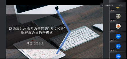 紧接着李迅老师汇报了“以语言运用能力为导向的‘现代汉语’课程混合式”。李老师从现代汉语课程教学的瓶颈问题切入,然后确立课程改革目标,进而提出课程改革措施。李老师从调整教学内容、确定教学设计框架、优化教学方法、建设线上资源、细化考核标准、跟踪学习行为等六个方面,详细而深入地讲解了课程改革的具体措施。条理清晰,数据详实,展现了深厚的教学积累。