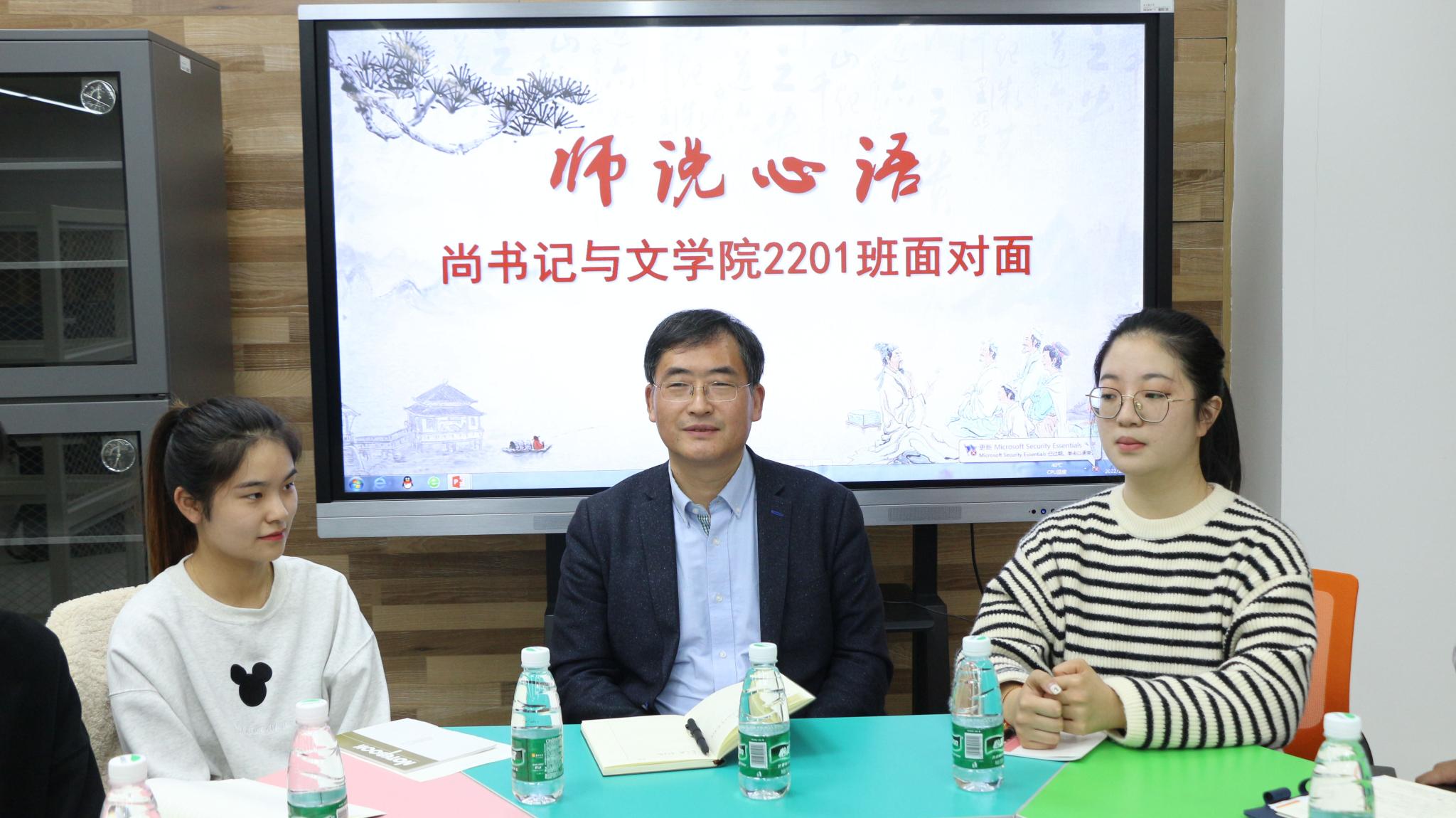 会议伊始,孙辉对尚书记、以及参加本次活动的老师和同学表示欢迎与感谢。接着,由必一运动获得第二届江苏省教师国家通用语言文字教学能力大赛省级决赛特等奖的蒋梦茹同学、二等奖的沙妍同学带来她们的学习经验分享。蒋梦茹讲述了公司老师们耐心指导自己改写教案,纠正自己普通话发音的经历;沙妍分享了个人学习心得:平时多积累知识,拓宽视野;多尝试与挑战,积极参加比赛活动。听完同学们的分享,尚书记对同学们给予了充分的认可,并向大家提出了三点建议与期望:第一勤学好学,深入思考,养成阅读的习惯;第二多看多练,努力提高自己的专业技能水平,夯实师范生的能力培养;第三,充分利用校院的平台,充实自我、展示自我,锻炼自我,切实提升个人综合能力。最后,2201班的同学们与尚书记,以及各位老师、学姐就个人学习与生活中遇到的问题与困惑进行交流,现场氛围轻松愉悦。其中,尚书记对同学们提出的问题给予一一解答,并结合自己的成长经历,鼓励同学们珍惜大学四年的时光,磨炼本领,在不懈奋斗中绽放青春的风采。