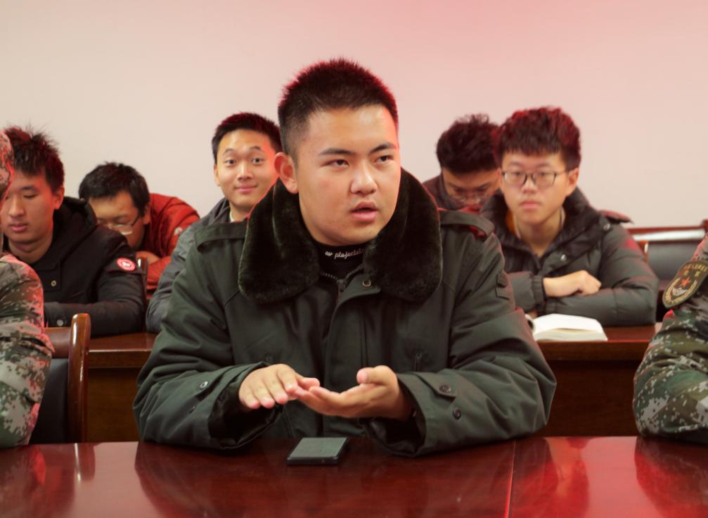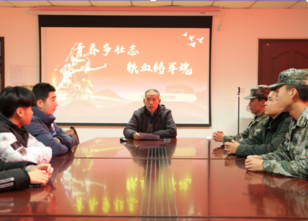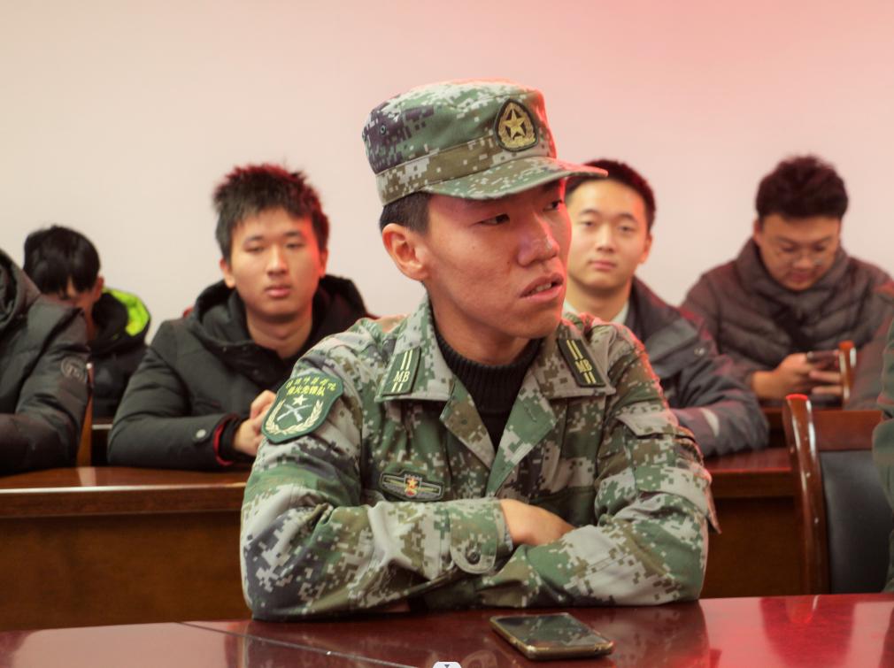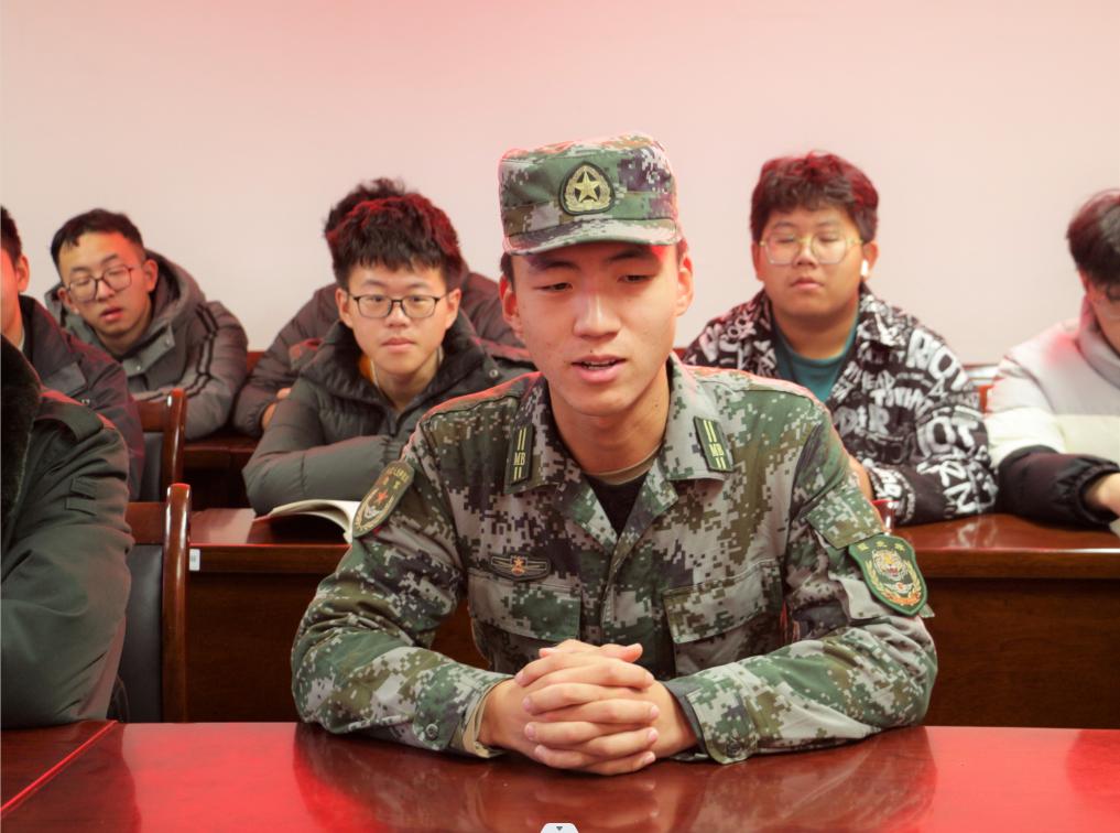 会上,王老师与大家一起观看了“江苏省人民政府征兵宣传片”,退役员工顾程文、朱竞超、韩锐等3位同学,先后畅谈了在部队的生活,分享了个人的成长经历,表示两年的军旅生活磨炼了自己的意志,加深了对爱国、责任、荣誉、使命的理解。辅导员王云路老师就2023年征兵工作作重要讲话。他勉励同学们心怀家国天下,不负青春韶华,投身强军伟业,书写无悔青春,在中国梦强军梦的生动实践中追求人生价值,谱写人生华章,为祖国和人民撑起一片和平的蓝天!为实现新时代强军目标贡献才智和力量!