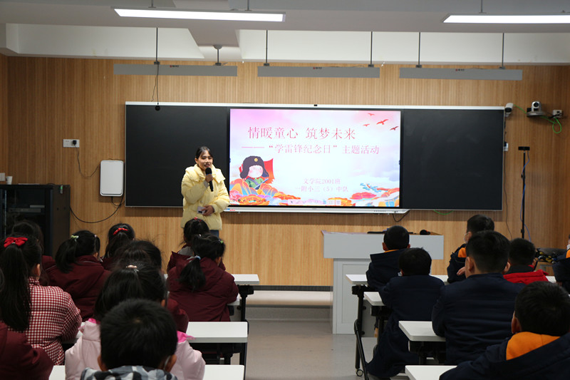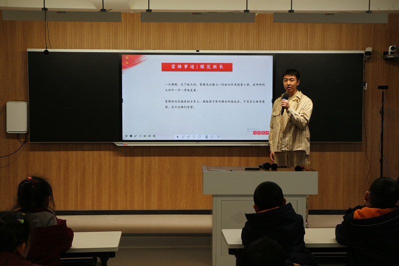 王靖如摘录了雷锋日记中的五句名言,邀请部分小朋友一起诵读。大家又共同朗诵了郭沫若的诗歌《满江红·雷锋》,孩子们铿锵有力的声音、饱含深情的眼神,将誓言读在口中,记在心里,转化为一份份信念。程颖与张媛媛表演了2022年北京冬奥会主题曲《一起向未来》的手势舞,小朋友们也积极加入,全场气氛热烈。最后,王靖如带领孩子们共唱《学习雷锋好榜样》,经典的旋律回旋耳畔,也让雷锋精神在每个孩子的心中熠熠生辉、生根发芽。活动结束,辅导员张娟和管婷婷及时对活动进行了总结,大家也畅所欲言,表达了对活动的感受。