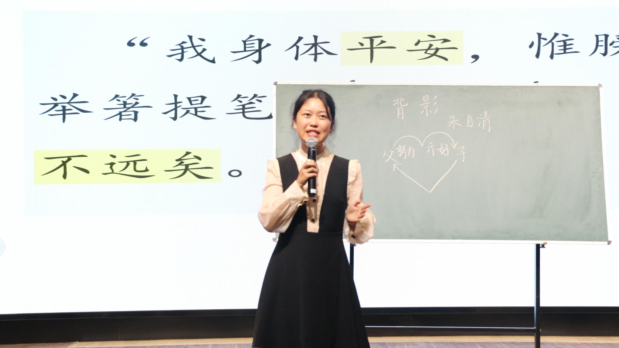 中文系主任刘飞,文创系主任姜春和对外汉语系主任王燕分别为大家介绍了本专业的特色与成就,并寄语新同学能在未来成为本专业的骄傲。中文系员工代表2001班姚力嘉带来了《背影》的演课展示,抑扬顿挫的语调,大方贴切的形体语言,充分展示了文学院师范生扎实的专业功底、良好的公司产品素养和积极向上的精神风貌。