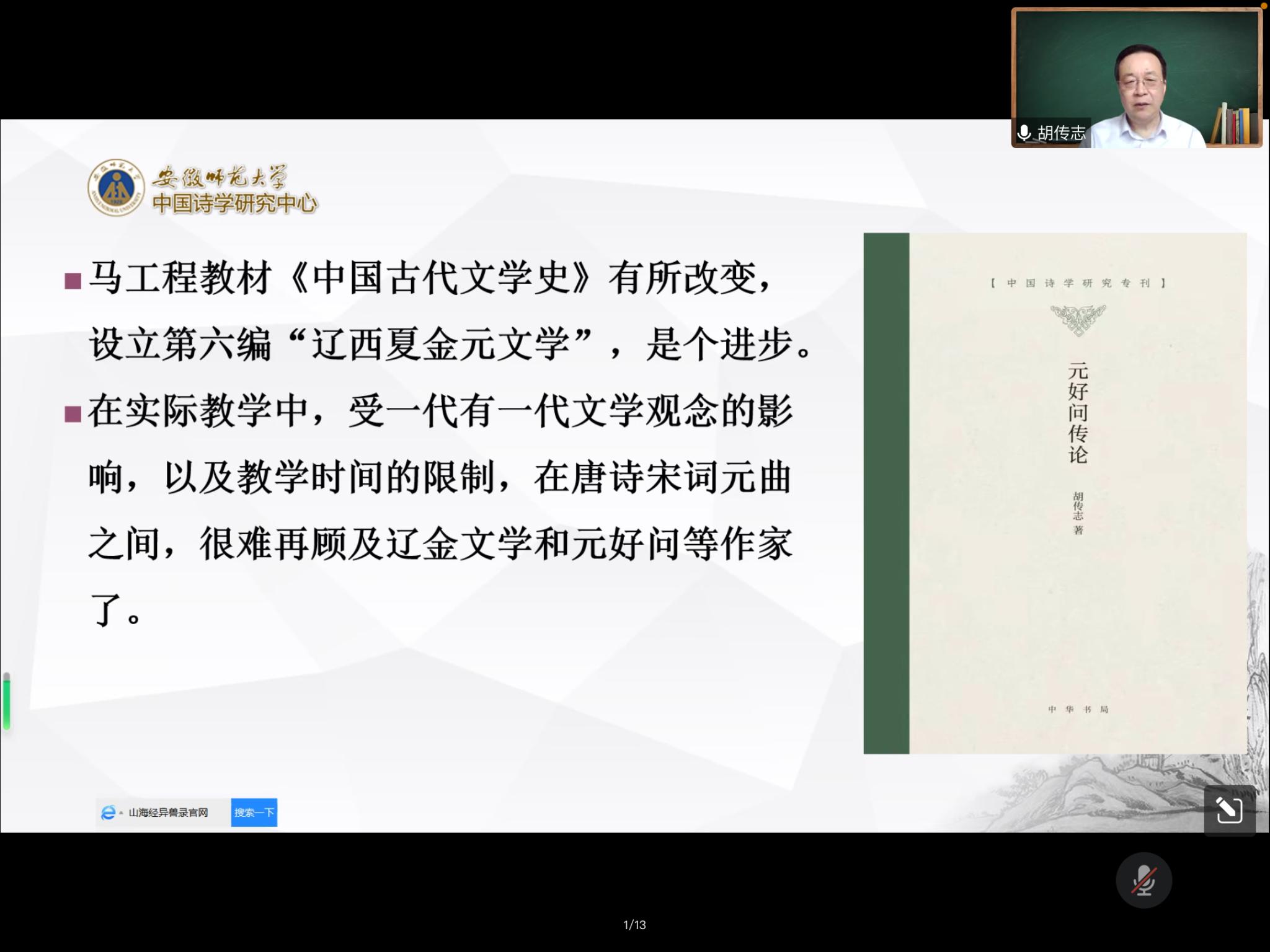 胡传志首先指出马工程教材《古代文学史》设立第六编“辽西夏金元文学”的重要作用,同时介绍了元好问的时代背景。胡传志按照文体从诗、词、散文、小说和其他著述五个部分层层深入地讲述了元好问的艺术成就。他指出,元好问具有多重身份,但最终确定的身份是诗人,是因为其论诗绝句和丧乱诗成就最高,元好问的论诗继承了杜甫的论诗七绝传统,影响深远;其词继承苏辛传统,着重用词来抒写人生况味;其散文成就虽不能与唐宋八大家相比,但也具有一定的地位,清人李祖陶将元好问编入《金元明八大家文选》,可见一斑;其撰写的小说《续夷坚志》恢复了一般文人“游戏笔端,资助谈柄”的常态;其散曲得风气之先,对推动变词为曲有着重要作用;其编撰的金代诗歌总集《中州集》,树立了总集编纂的新典范。