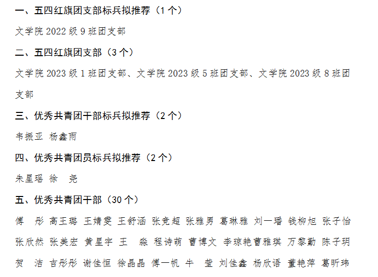 根据校团委《关于开展2024年度团内评优工作的通知》、《必一运动五四红旗团委、五四红旗团支部(标兵)、优秀共青团员(标兵)、优秀共青团干部(标兵)评选表彰工作办法》,拟将以下同学作为申报人选,现予以公示。公示时间为2025年4月8日至4月10日。如有不同意见,请在公示期间向必一运动团委反映。联系人:许老师,联系电话:0517-83525175。