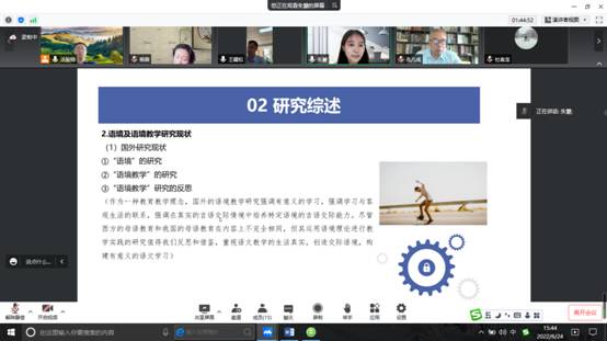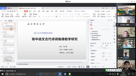 七位研究生分别以《高中语文古代诗词格律教学研究》《基于思辨性阅读与表达学习任务群的大单元教学研究》《基于学习任务群的高中古诗词比较阅读教学研究》《语境理论视域下的高中语文专题教学研究》《语体学视域下高中实用类文本阅读教学研究》《高中语文古代诗词格律教学研究》《走向深度学习的高中整本书阅读教学》为题,从选题背景与意义、研究现状及趋势、研究目标与内容、研究方法与创新之处等方面向各位专家进行汇报。专家们在认真阅读分析各位硕士生开题报告书后,结合自己的教学与学术研究经验,对七位硕士生的论文由选题到文献综述、写作提纲、研究方法、案例准备等方面,提出了指导性的建议。